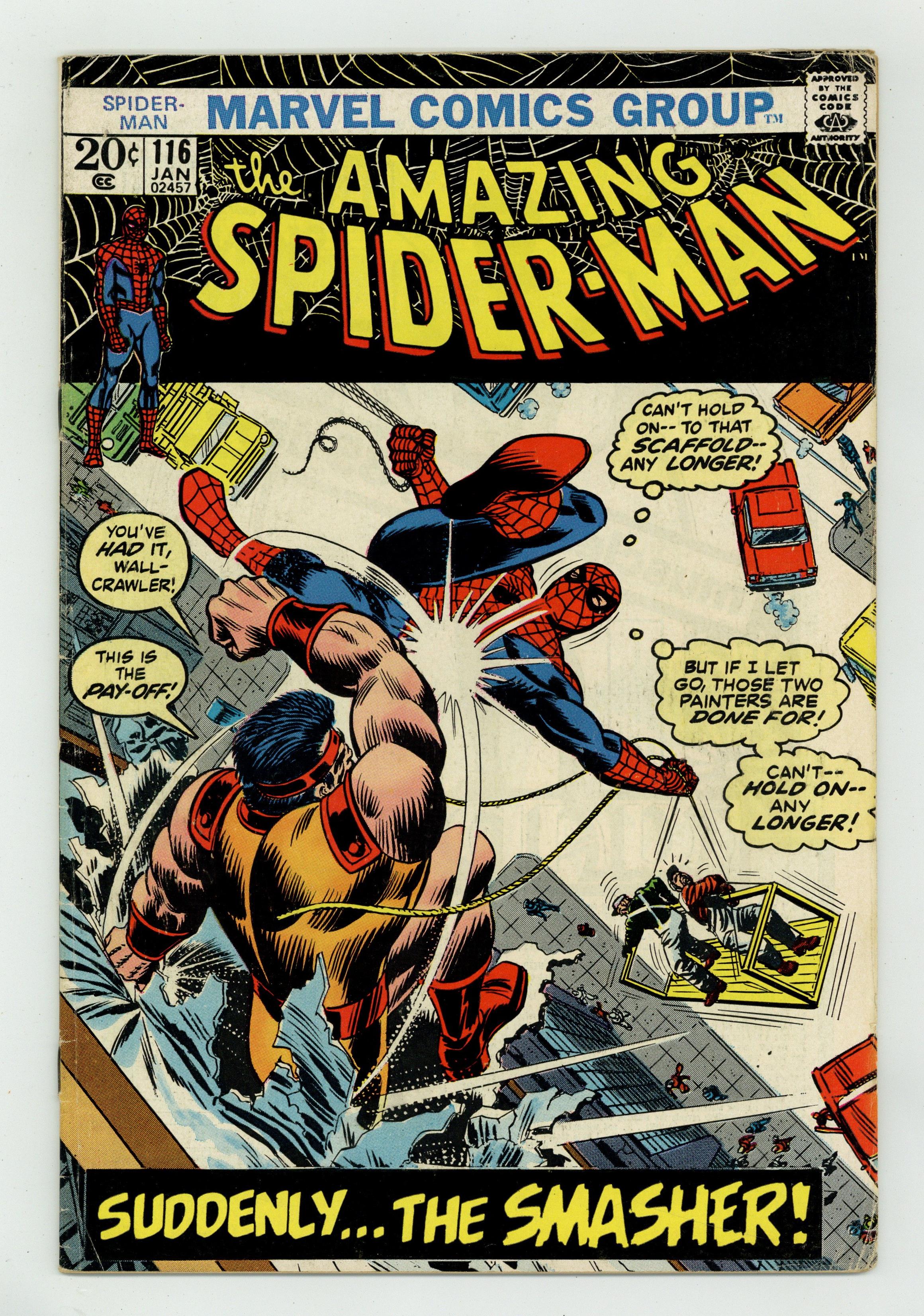 "Suddenly...the Smasher!" Part 1 of 3. Script by Stan Lee (original) and Gerry Conway (updates). Pencils by John Romita. Inks by Jim Mooney and Tony Mortellaro (backgrounds). Cover by John Romita. The gang war is over, and the Spectacular Spider-Man wants to get back to his normal life. But while web-swinging to the Daily Bugle, he's ambushed in mid-air by the Smasher! Who? The web-spinner doesn't recognize his large opponent, but he battles him to a standstill and saves the lives of two high-rise painters. In the meantime, a new candidate -- named Richard Raleigh -- is running for mayor. And he's holding a big indoor rally that Peter, Gwen Stacy, and Mary Jane attend! However, when the ceiling plaster starts falling, the wall-crawler leaps into action to keep the rally-goers safe! Is someone trying to ruin Raleigh's campaign? Cameo appearances by J. Jonah Jameson, Joe Robertson, Betty Brant, and Harry Osborn. (Notes: ASM issues 116-118 are a revised, re-edited, and colorized version of Spectacular Spider-Man Magazine #1 -- published in black and white in 1968. The script and art contain many updates (including new pages) in order to fit into Spider-Man's current continuity. ASM 116 was reprinted in Marvel Tales #95.) 36 pages. Cover price $0.20. Grade: FN 6.0 explanation of grade Condition: Used (collectible)