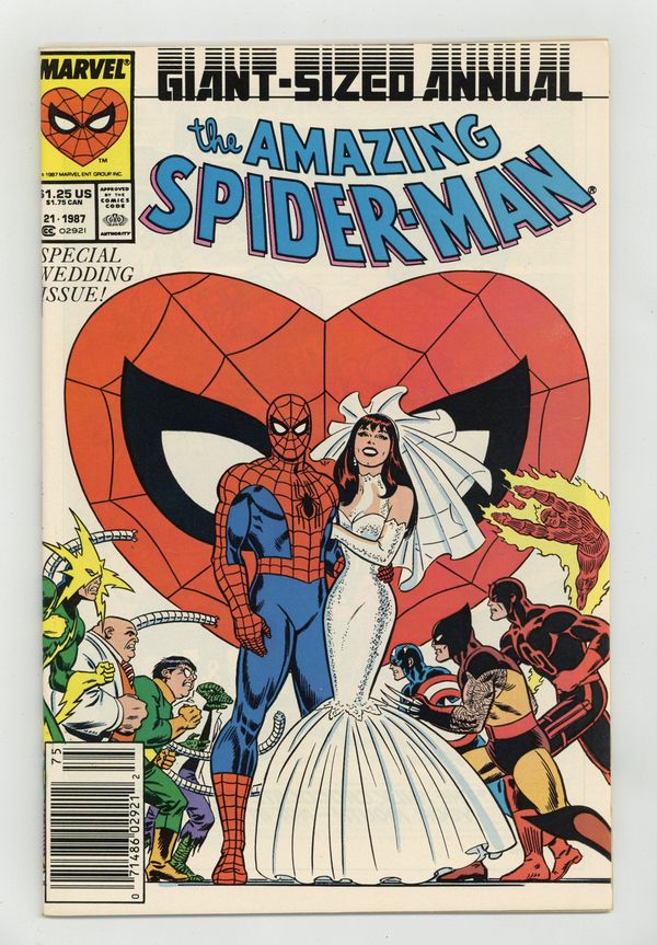 Newsstand Edition. The marriage of Peter Parker and Mary Jane Watson in "The Wedding." Plot by Jim Shooter. Script by David Michelinie. Pencils by Paul Ryan. Inks by Vince Colletta. Cover by John Romita Sr. Newsstand Edition. At long last wedding bells ring for Peter Parker and Mary Jane Watson! What an exciting day! The blushing bride will need something old, something new, something borrowed, and something blue! While the Amazing Spider-Man will need to take care of two things before the big day! First, the easy task...short circuit Electro's latest scheme! And second, the tough one...put the memory and heartache of Gwen Stacy in the past forever. Will another trip to the Brooklyn Bridge bring peace to the wondrous wall-crawler? Or will the ghosts of days gone by derail a bright future with Mary Jane? Carpe diem, web-slinger! Appearances by Flash Thompson, Harry Osborn, Liz Osborn, Betty Leeds, Aunt May, Anna Watson, Joe Robertson, J. Jonah Jameson, and Willi Smith. Flashback cameos by the Green Goblin, Gwen Stacy, and Uncle Ben. (Notes: Peter and Mary Jane go on their honeymoon in Spectacular Spider-Man Annual 7. The Direct Edition cover features Peter Parker's friends and family. The Newsstand Edition depicts Spider-Man's friends and foes. Amazing Spider-Man Annual 21 was one of the first issues Marvel published with two different covers. This story was reprinted in the 1991 trade paperback: the Amazing Spider-Man - The Wedding.) 52 pages. Cover price $1.25. Grade: VF 8.0 explanation of grade Condition: Used (collectible)