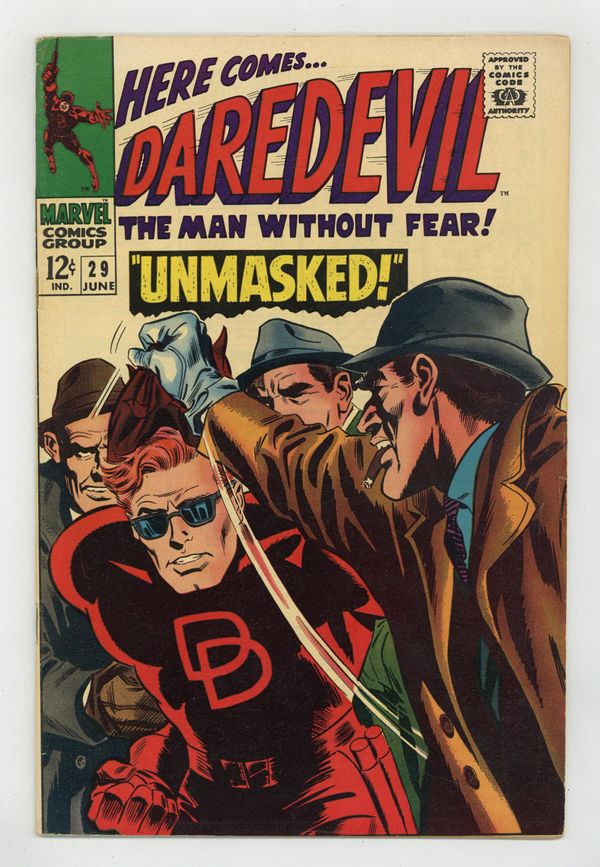 Cover pencils by Gene Colan, inks by Frank Giacoia. Unmasked, script by Stan Lee, pencils by Gene Colan, inks by John Tartaglione; Matt decides to propose to Karen but when she is kidnapped by The Boss to try and draw out Daredevil, he decides his lifestyle is too dangerous for domesticity and halts his plans. 36 pgs. Cover price $0.12. Cover price $0.12. Grade: FN 6.0 explanation of grade Condition: Used (collectible)