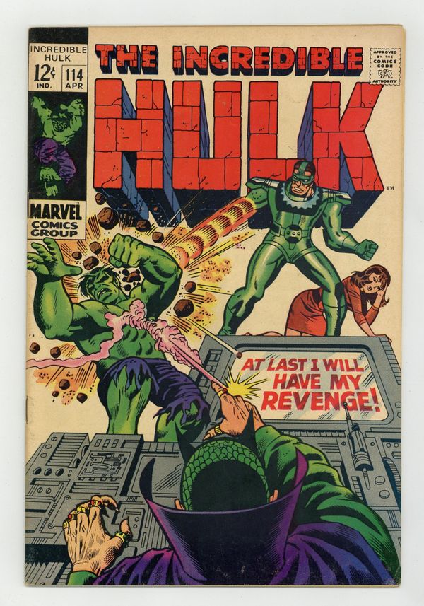 Cover pencils by Herb Trimpe, inks by Dan Adkins. At Last I Will Have My Revenge!, script by Stan Lee, pencils by Herb Trimpe, inks by Dan Adkins; Itching for revenge after his recent defeat, the Mandarin figures that if he combines his might with that of the Sandman, they can finally succeed in beating the Hulk; They can't; After the battle, the military busts in and captures the Hulk once again. 36 pgs. $0.12. Cover price $0.12. Grade: VG/FN 5.0 explanation of grade Condition: Used (collectible)