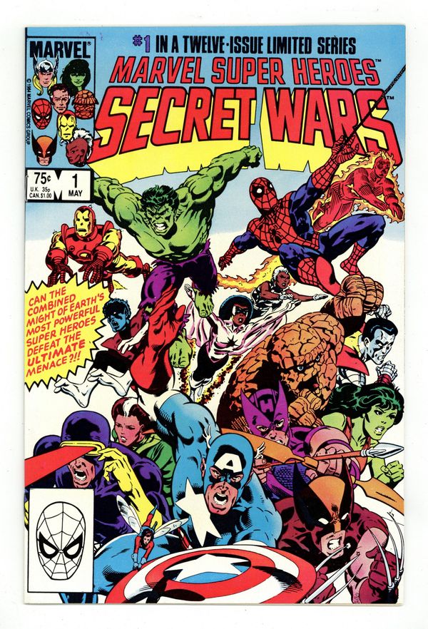Direct Edition. "The War Begins!" Part 1 of 12. Story by Jim Shooter. Art by Mike Zeck and John Beatty. This is it, the granddaddy of all epic events. Before Identity Crisis, Infinite Crisis, House of M, Civil War, and Infinity Gauntlet there was Secret Wars. A nigh omnipotent being from beyond has, for lack of a better word, kidnapped the greatest heroes and deadliest villains in the Marvel Universe and whisked them to the far side of the universe to battle for the ultimate prize. One thing is for certain, the lives of these heroes and villains will never be the same again. - This is the first printing. Any 2nd printing will have the words "Second Printing" at the bottom of the first page. NOTE: Nearly all first printings contain a "Blue Galactus" from a printing error (a lack of magenta printing plates) that was corrected in later printings. While small number of First printings may have the correct colors, the majority of copies will have "Blue Galactus". Due to the frequency, "Blue Galactus" variants should be treated the same as other First Printings. 36 pages, full color. Cover price $0.75. Grade: VF+ 8.5 explanation of grade Condition: Used (collectible)