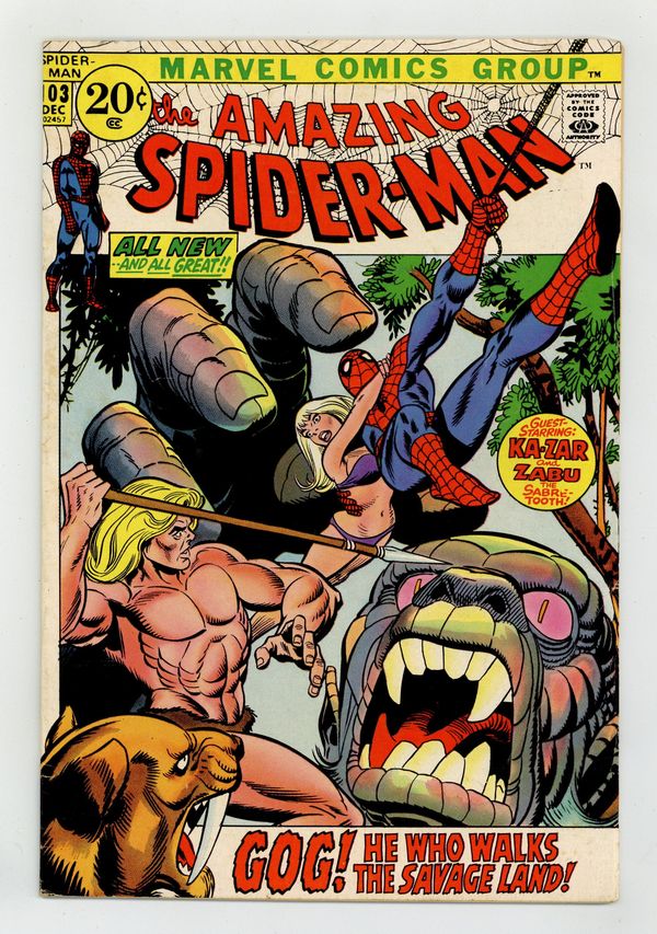 "Walk the Savage Land!" Part 1 of 2. Guest-starring Ka-Zar. Script by Roy Thomas. Pencils by Gil Kane. Inks by Frank Giacoia. Cover by Gil Kane and Frank Giacoia. Spider-Man and Gwen Stacy in the Savage Land with Ka-Zar!What a cover preview! But how did they get there? The story begins a few days earlier when J. Jonah Jameson -- upset about the Daily Bugle's declining circulation numbers -- hears a tale about a mysterious monster in the Savage Land. Jonah immediately orders an in-depth feature on Ka-Zar'shidden jungle to boost the Bugle's sales! And he will lead the expedition to Antarctica himself! However the Savage Land is fraught with danger. Shortly after the group arrives, the gigantic monster called Gog grabs Gwen!And the web-slinger will move heaven and earth...and anything else in the Savage Land...to get her back! Cameo appearances by Joe Robertson, Zabu, and Kraven the Hunter. First 20ยข cover price. (Notes: Ka-Zar and the web-slinger first met in Amazing Spider-Man #57. This issue was reprinted in Marvel Tales #81 and #82.) 36 pages. Cover price $0.20. Grade: VG+ 4.5 explanation of grade Condition: Used (collectible)