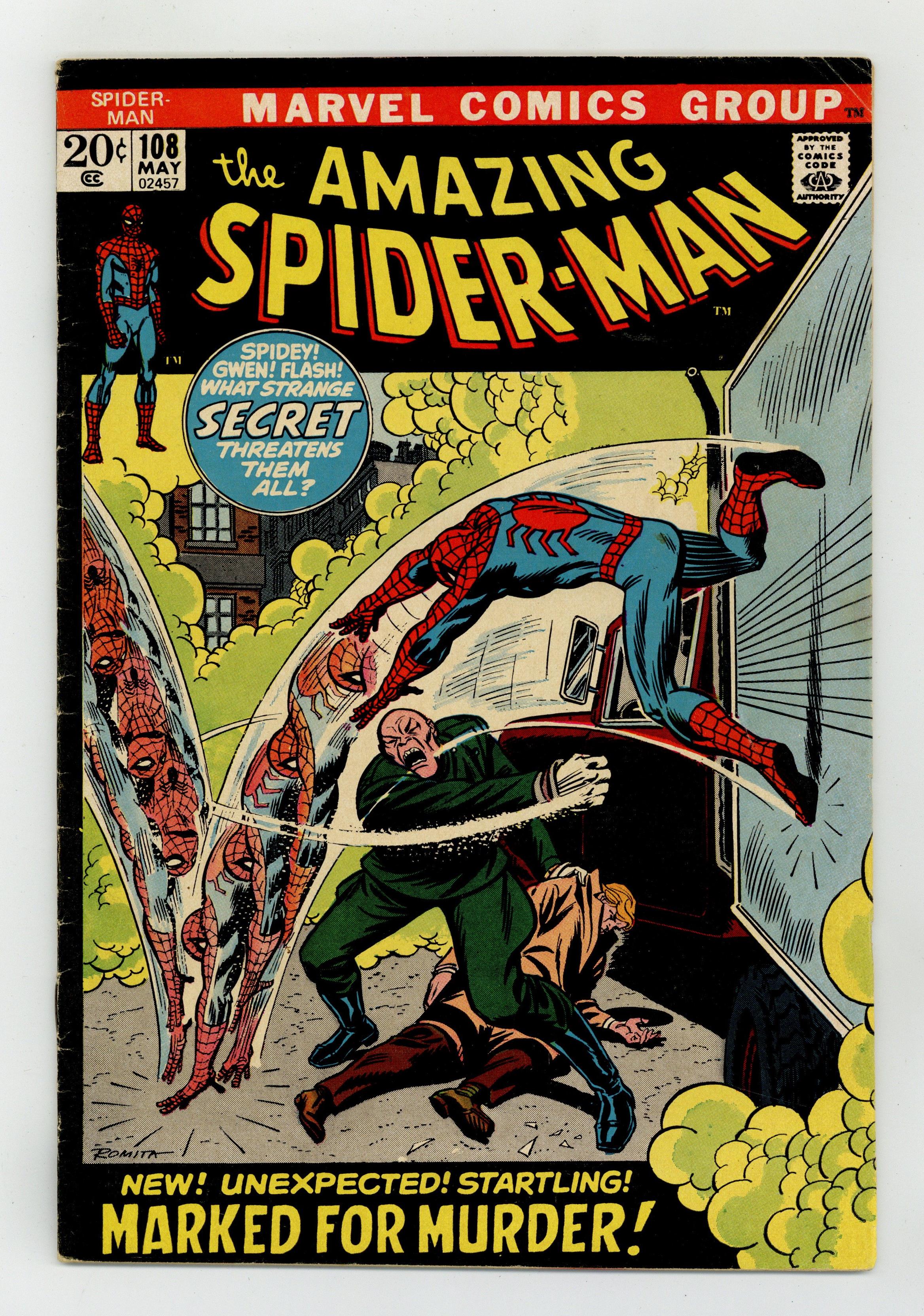 "Vengeance from Vietnam!" Part 1 of 2. Script by Stan Lee. Pencils by John Romita. Inks by John Romita and Tony Mortellaro (backgrounds). Cover by John Romita. Flash Thompson learns the hard way that a man cannot outrun his past. During his tour in Vietnam, Flash discovered a sacred hidden temple in the jungle. And despite his best efforts to save the temple, it was destroyed by artillery fire. Now several months later followers from the temple are in New York for revenge. Spider-Man, Gwen Stacy, and the Military Police try their best to protect Flash, but the death squad from Vietnam grabs him! And next issue the wall-crawler will go for broke to save his long-time rival: Flash Thompson! First appearance of Sha Shan Nguyen. Cameo appearances by Aunt May and Harry Osborn. (Notes: The letters page includes a letter from comics writer David Michelinie -- who would eventually write the ASM title years later. This story was reprinted in Marvel Tales #87. The letters page also contains a statement of ownership: average print run 520,862; average paid circulation 307,550.) 36 pages. Cover price $0.20. Grade: VG- 3.5 explanation of grade Condition: Used (collectible)