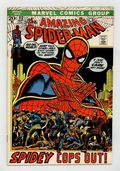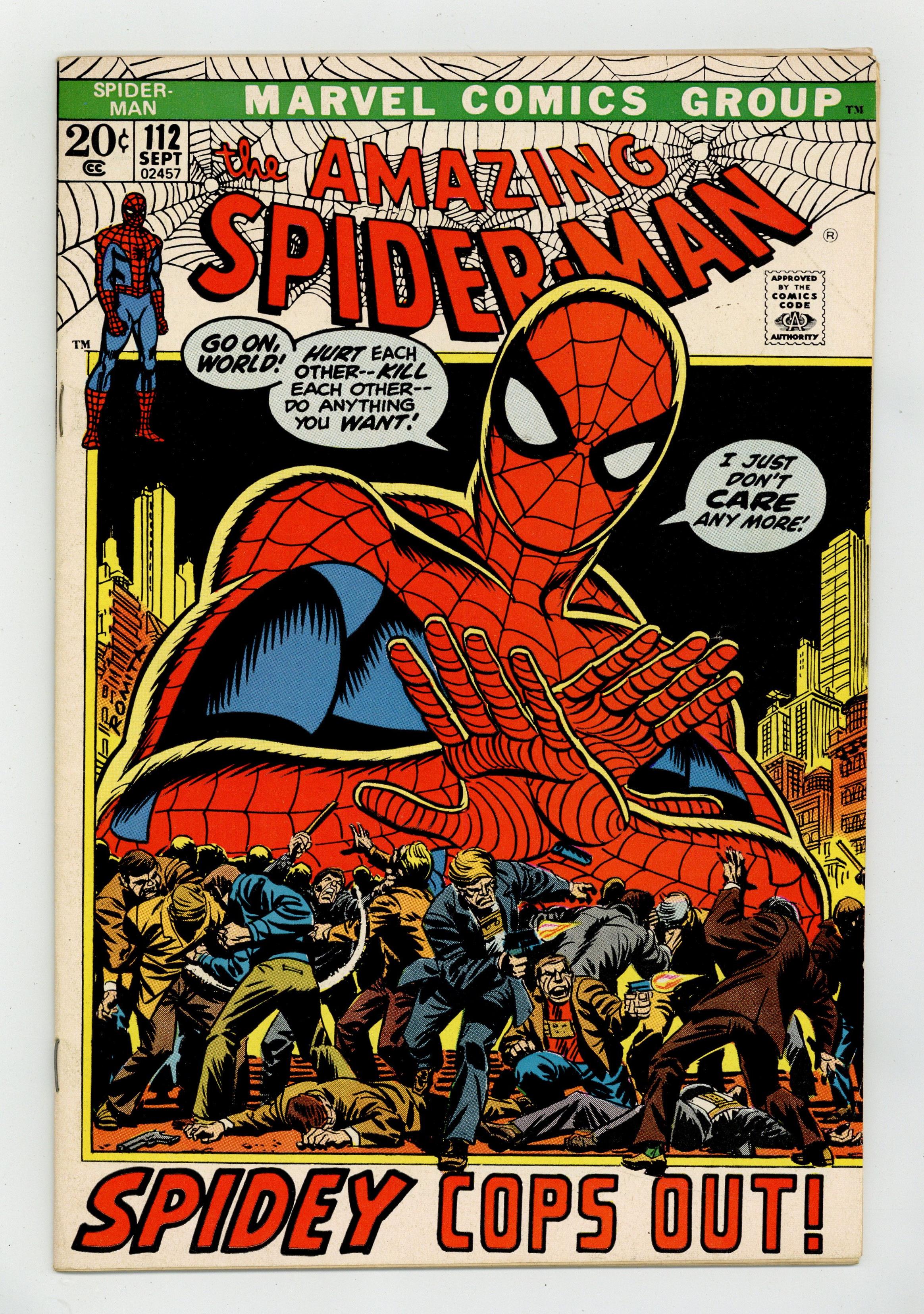 "Spidey Cops Out!" Script by Gerry Conway. Pencils by John Romita. Inks by John Romita and Tony Mortellaro (backgrounds). Cover by John Romita. Peter Parker is desperately searching for his dear Aunt May! She has been missing for several days now, and her web-slinging nephew is worried sick. In fact, Spider-Man passes on a few crime-busting activities in order to find her. Unfortunately, the Daily Bugle gets wind of the wall-crawler's newfound indifference, and JJJ pounces! But Peter doesn't care as he continues his search. On the Lower East Side, the web-slinger's spider-sense goes off! Has Spider-Man found his aunt? Not unless May Parker has suddenly added four mechanical arms! Cameo appearances by the Gibbon, Harry Osborn, Betty Brant, Joe Robertson, Mary Jane Watson, Anna Watson, Flash Thompson, Gwen Stacy, and Dr. Octopus. (Notes: John Romita is credited as a co-plotter of the story. This issue was reprinted in Marvel Tales #91.) 36 pages. Cover price $0.20. Grade: FN- 5.5 explanation of grade Condition: Used (collectible)