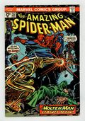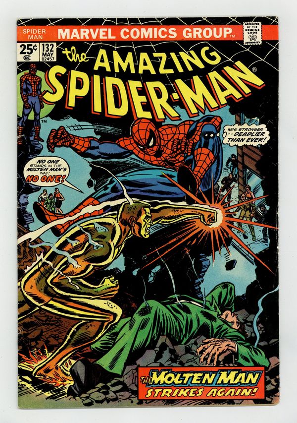 Cover by Gil Kane and John Romita Sr. The Master Plan of the Molten Man!, script by Gerry Conway, pencils by John Romita Sr., Paul Reinman, and Tony Mortellaro, inks by Paul Reinman and Tony Mortellaro; Trouble arises for both Peter Parker and Ned Leeds, as the Molten Man continues his reign of terror!; With Molten Mans powers strengthened, will Spider-Man be able to overcome one of his greatest opponents yet?; Plus, Ned finds himself in grave danger after being exposed to heavy radiation. Ad for bronze collectors' medallion coins with Spider-Man, Hulk, and Conan images. Marvel Value Stamp #6 featuring Thor. Deadly Hands of Kung Fu ad. Reprinted in Marvel Tales # 109. 36 pgs., full color. $0.25. Cover price $0.25. Grade: FN- 5.5 explanation of grade Condition: Used (collectible)
