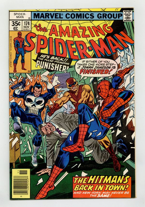 "The Hitman's Back in Town!" Part 1 of 2. Guest-starring the Punisher. Script by Len Wein. Art by Ross Andru (breakdowns), Jim Mooney (finishes), and Tony DeZuniga (finishes). Cover by Ross Andru and Frank Giacoia. The Hitman is back! And he's got a brand new target: J. Jonah Jameson! But there's another gun-toting vigilante back in town too: the Punisher! And he's tracking the Hitman! Mix in the wondrous wall-crawler...and as shown on the dynamic cover, all concerned parties come together in JJJ's corner office! Pandemonium erupts when the bullets start flying! Stay down Jonah! Let Spidey and the Punisher take the hit (man)! Cameo appearances by Harry Osborn, Flash Thompson, Dr. Marla Madison, and Dr. Bart Hamilton. First 35ยข issue. (Notes: The Hitman previously appeared in Spectacular Spider-Man 5. This story was reprinted in Marvel Tales 216.) 36 pages Cover price $0.35. Grade: VF- 7.5 explanation of grade Condition: Used (collectible)