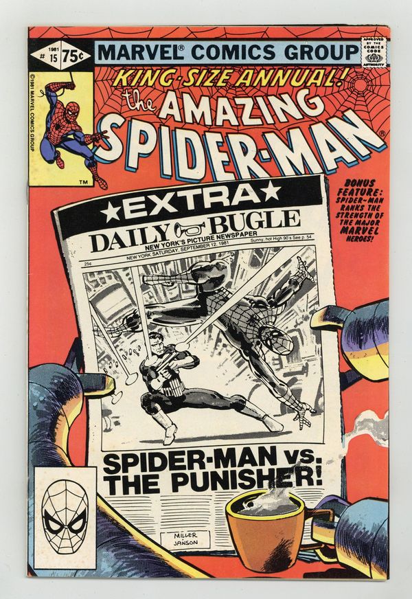 Direct Edition. "Spider-Man: Threat or Menace?" Guest-starring the Punisher. Script by Denny O'Neil. Art by Frank Miller (breakdowns) and Klaus Janson (finishes). Cover by Frank Miller and Klaus Janson. The dynamic art tandem that took the Daredevil series to new heights in the early 1980's teams up to bring Spider-Man and the Punisher together again! But this time the web-slinger and the gun-toting vigilante are not facing the likes of Jigsaw or the Hitman! Their adversary is a certain six-armed super-villain...planning nothing less than the murder of five million people! The Punisher takes the first shot at Dr. Octopus in the city morgue! And later on, the wondrous wall-crawler takes the last one at the Daily Bugle! Can Spidey get the story to press before Doc Ock? An excellent annual! Second feature: "Just How Strong Is...Spider-Man?" Script by Mark Gruenwald. Art by Mark Gruenwald (layouts) and Bob Layton (finishes). The heroes of the Marvel Universe are ranked in order of their physical strength. The first tier consists of the Hulk, Hercules, Thor, Wonder Man, and Iron Man. The Thing and the Sub-Mariner headline the second tier. Spider-Man is in the third tier. This may be the first such "power ranking" attempted...thus making it a landmark backup feature. Third feature: "Peter Parker's Apartment!" Script by Roger Stern. Art by Marie Severin and Terry Austin. One-page illustration of Peter's Chelsea apartment correcting the errors in Amazing Spider-Man Annual 13. Fourth feature: "A Gallery of Spider-Man's Most Famous Foes!" Script by Roger Stern. Art by Keith Pollard, Greg LaRocque, and Frank Giacoia. 4 pages of pin-ups featuring the Man-Wolf, Jackal, Punisher, and Tarantula. (Notes: Dr. Octopus previously appeared in Captain America 259. The Punisher appears next in Daredevil 181 & 182. This story was reprinted in the trade paperback The Sensational Spider-Man (1988); and also in the (1994) Complete Frank Miller Spider-Man.) 52 pages. Cover price $0.75. Grade: FN+ 6.5 explanation of grade Condition: Used (collectible)