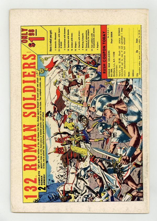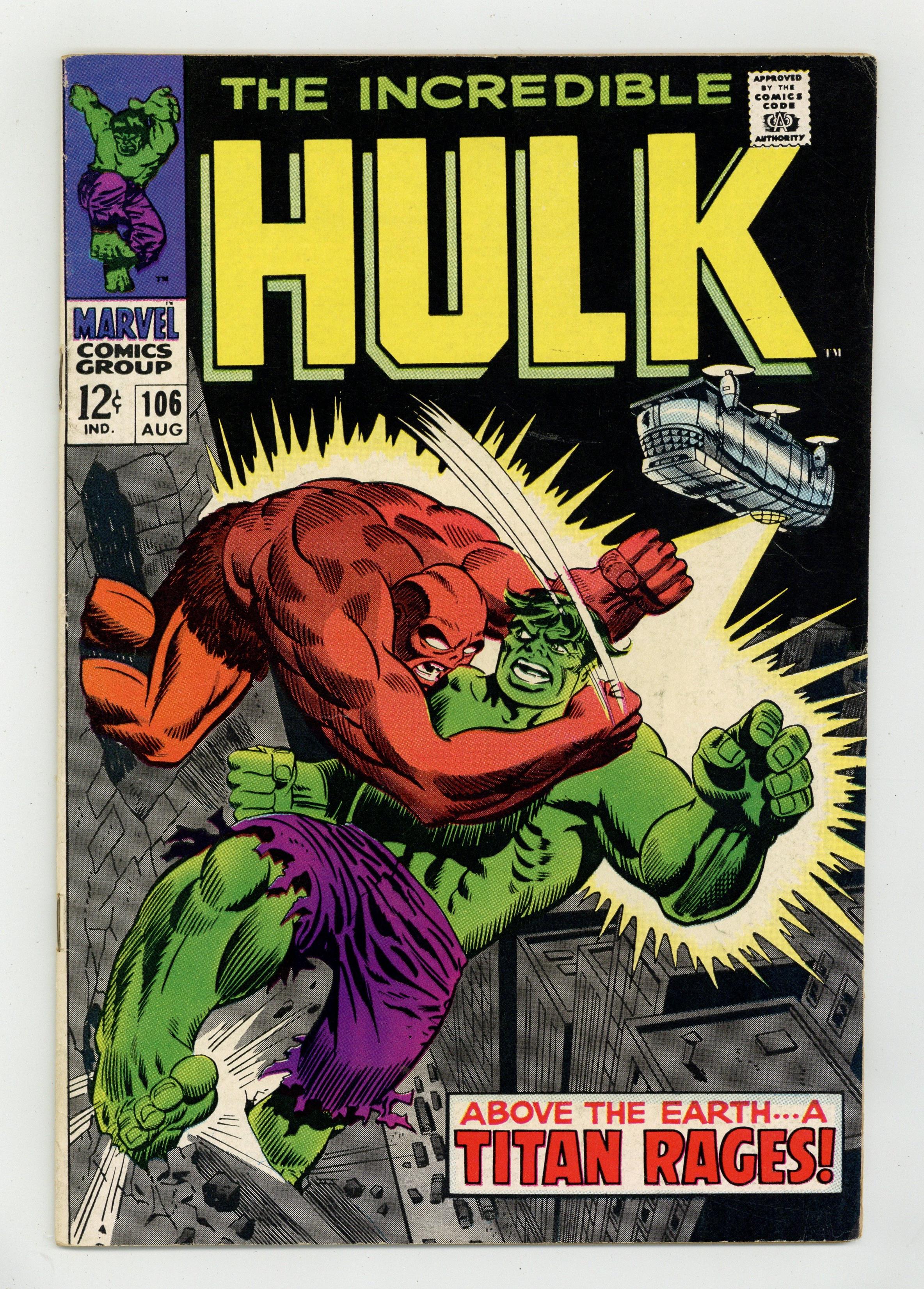 Cover pencils by Marie Severin, inks by Frank Giacoia. Above the Earth -- a Titan Rages!, script by Archie Goodwin (Pgs. 1-10) and Roy Thomas (Pgs.11-20), pencils by Marie Severin (layouts) and Herb Trimpe, inks by George Tuska; Banner once again becomes the Hulk as the battle with the Missing Link continues; Nick Fury and SHIELD move in to help out Ross in capturing the two monsters; During the fight, what everyone thinks is the helicarrier beams the tusseling titans aboard but it actually turns out to be a Russian ship manned by Brevlov; The Russians test the Missing Link to find out how to use its power but the Hulk escapes his captivity and causes mayhem; The Hulk makes it back to terra firma just as the Missing Link finally overloads on radiation and explodes; Yuri and his men escape their doomed ship in a smaller saucer and even though the Hulk has just saved a small Russian boy from a burning house, Brevlov is pressured by his men to finish off the monster. House ad for the Spectacular Spider-Man #1, art by John Romita. House ad for Not Brand Echh #9, art by Marie Severin. 36 pgs. $0.12. Cover price $0.12. Grade: FN- 5.5 explanation of grade Condition: Used (collectible)