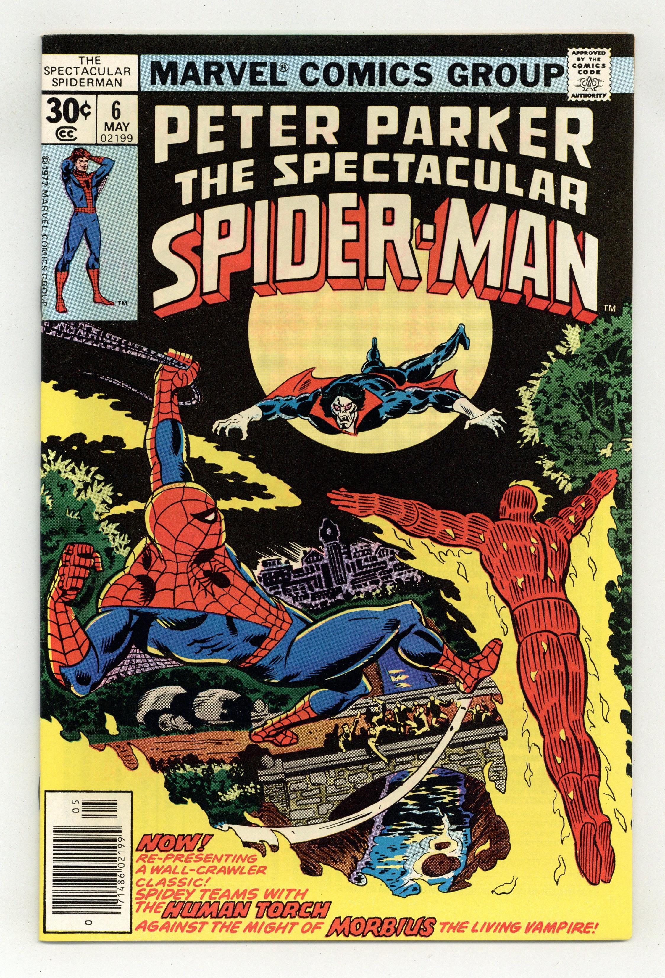 "The Power to Purge!" Script by Gerry Conway. Art by Ross Andru and Frank Giacoia. Cover by Al Milgrom. This issue reprints most of Marvel Team-Up 3 where Spider-Man and the Human Torch teamed up to battle Morbius the Living Vampire. The first two pages and the last page of this issue are new story and art. The web-slinger is feeling sick and reflects on the last time he felt this way (MTU 3). Cameo appearance by Morbius. (Note: The artist for the three new pages is not credited.) 32 pages Cover price $0.30. Grade: VF+ 8.5 explanation of grade Condition: Used (collectible)
