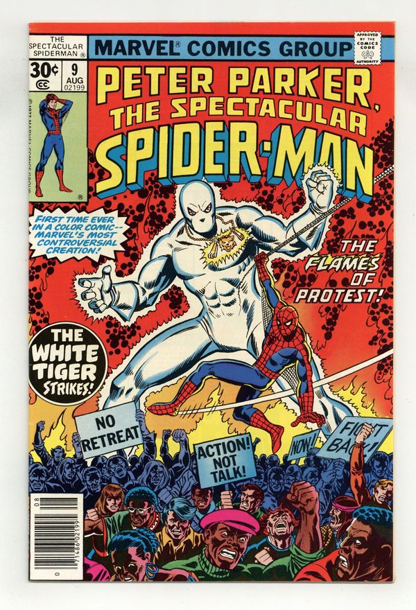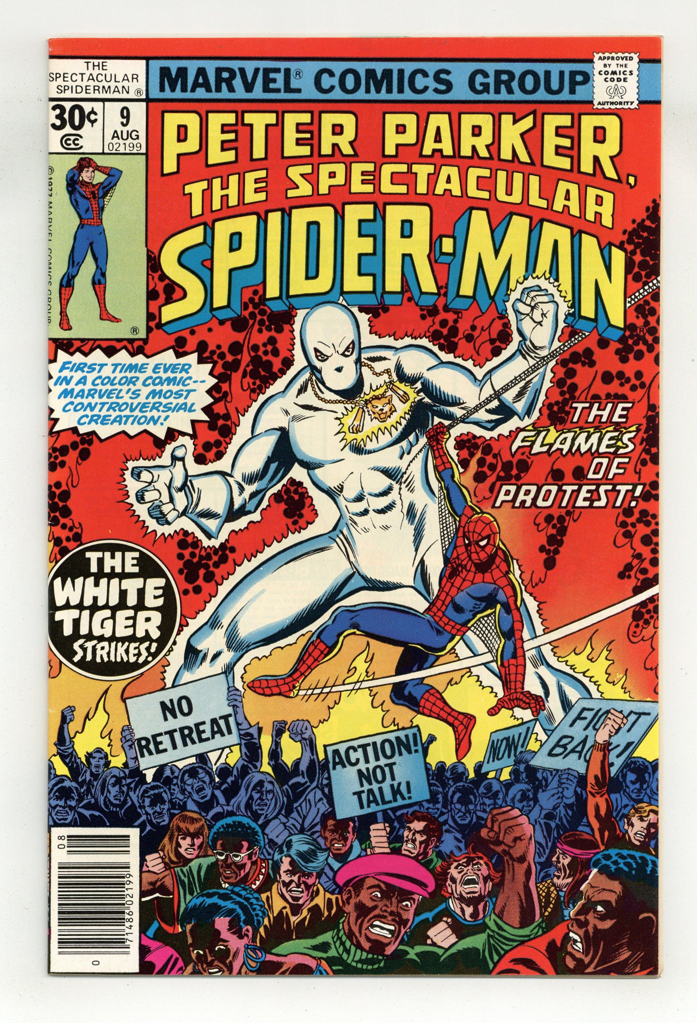 "Like a Tiger in the Night!" Part 1 of 2. First color comic appearance of the White Tiger. Script by Bill Mantlo. Art by Sal Buscema (breakdowns) and Mike Esposito (finishes). Cover by George Perez and Frank Giacoia. The Empire State University president is closing down the campus' night school, and the student body is very upset! The students want ESU to sell the prized Erskine Manuscripts to raise money. When the White Tiger apparently steals the manuscripts, tempers on campus reach a boiling point...and also set the White Tiger and the web-slinger on a collision course! Flashback cameos by Iron Fist, Jack of Hearts, Shang-Chi, the Prowler, and the Sons of the Tiger to recap the White Tiger's past adventures. (Notes: The White Tiger previously appeared in many issues of the black-and-white Deadly Hands of Kung Fu series. A 35-cent cover price variant exists for this issue.) 32 pages Cover price $0.30. Grade: VF- 7.5 explanation of grade Condition: Used (collectible)