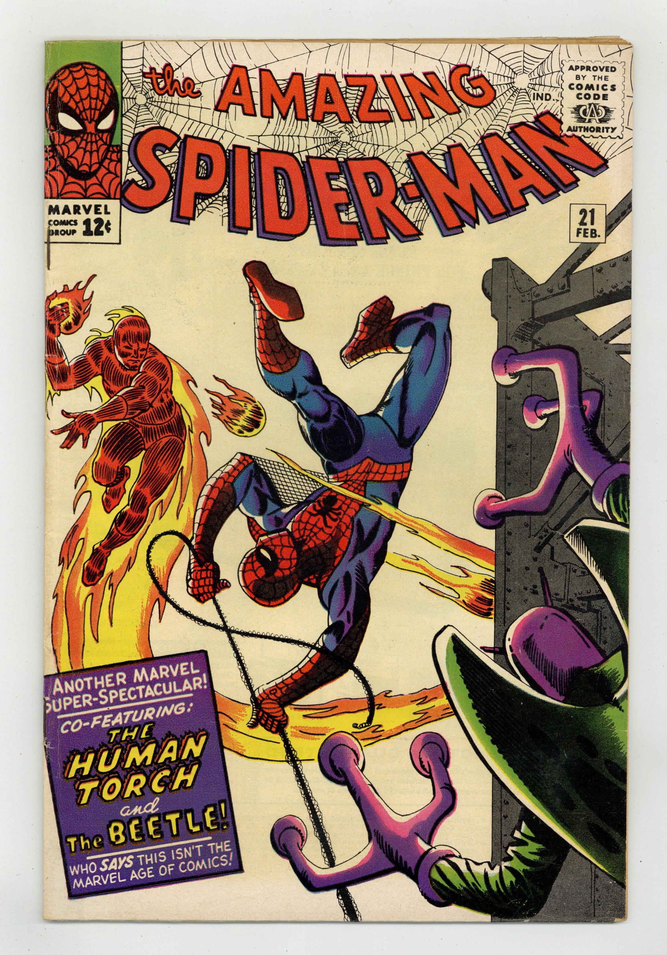 Cover art by Steve Ditko. Second appearance of the Beetle in Where Flies the Beetle...!, script by Stan Lee, art by Steve Ditko; after getting out of jail, Abner Jenkins dons his Beetle guise and prepares for revenge on the Human Torch; drama between Johnny Storm and Doris Evans and Peter Parker and Betty Brant; Human Torch teams with Spidey against Beetle. Reprinted in Marvel Tales # 16 and 159. Spider-Man pin-up by Ditko. 36 pgs. $0.12. Cover price $0.12. Grade: VG 4.0 explanation of grade Condition: Used (collectible)