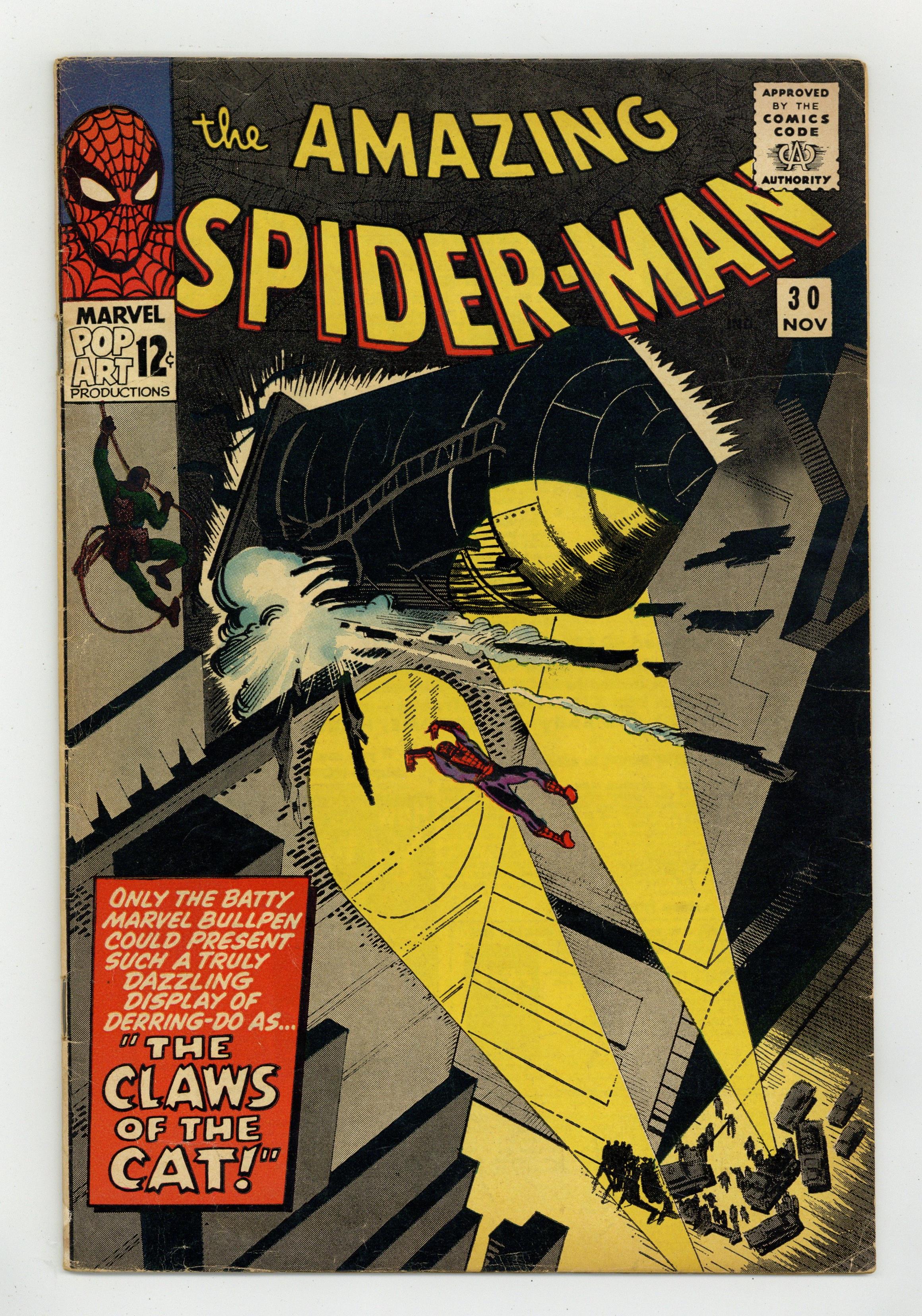 Cover by Steve Ditko. First appearance of the Cat (not the same character who would be introduced in "The Cat" # 1 from 1972 who would later become Tigra). The Claws of the Cat!, script by Steve Ditko (plot) and Stan Lee (script), art by Steve Ditko; Jameson offers a thousand dollar reward for catching The Cat, and Spider-Man plans to collect; Betty tells Peter that Ned has asked her to marry him. Ad for Marvel T-Shirts. A letter from Jack C. Harris. Reprinted in Marvel Tales # 23 and 169. 36 pgs., full color. $0.12. Cover price $0.12. Grade: VG 4.0 explanation of grade Condition: Used (collectible)