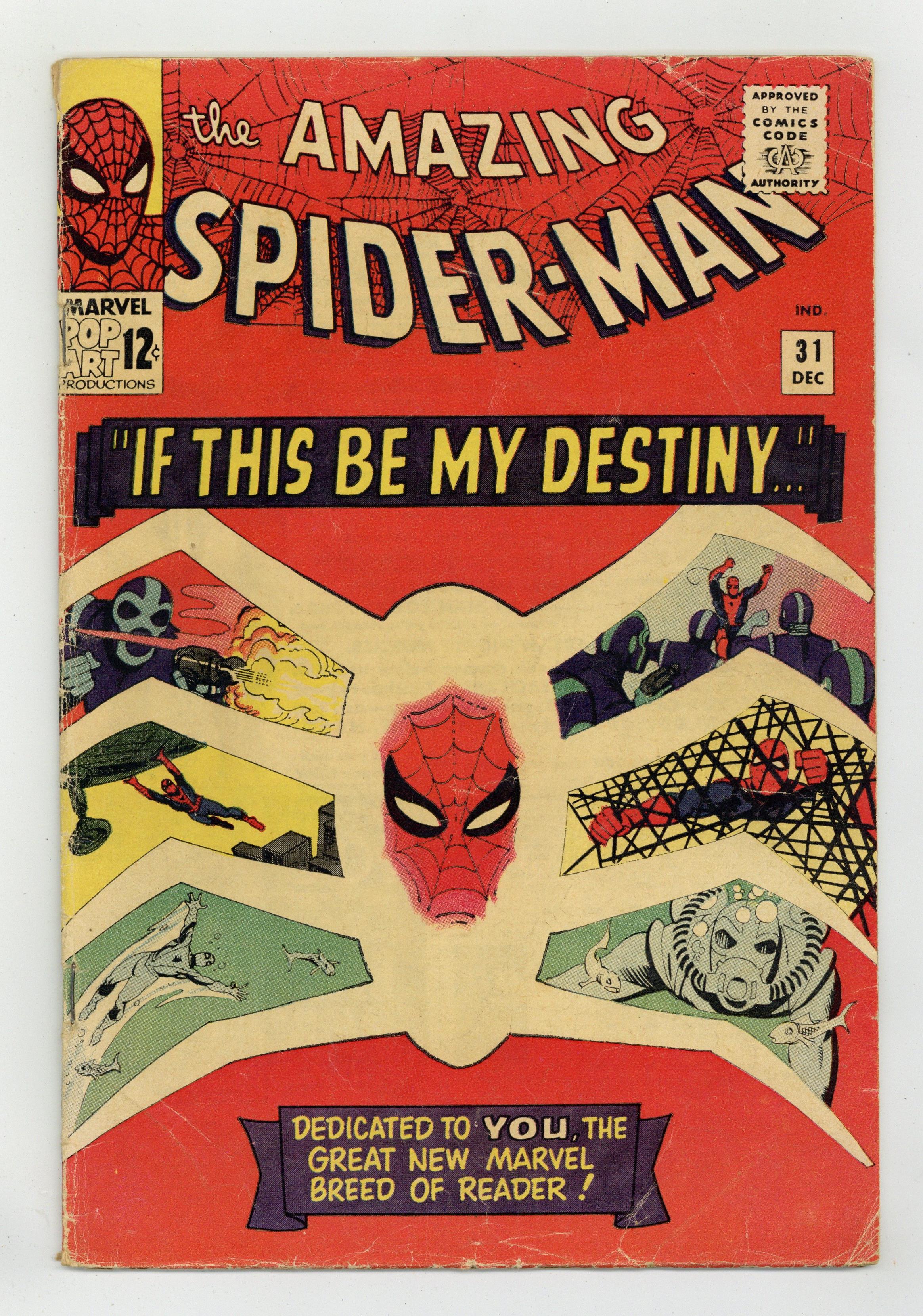 Cover by Steve Ditko. First appearances of Gwen Stacy, Harry Osborn, and Professor Warren. First appearance of the Master Planner (revealed in issue 32 to be Doctor Octopus) in "If This Be My Destiny, script by Steve Ditko (plot) and Stan Lee (script), art by Steve Ditko; Aunt May falls deathly ill on Peter's first day of college. Meanwhile, the Master Planner is stealing scientific gadgets. Marvel Bullpen Bulletins, art by Steve Ditko and Marie Severin; Bullpen Bulletins page discussing staff; Marvel Checklist; ads for Spider-Man T-Shirt and MMMS. Letter to the editor from comics writer Don McGregor. Reprinted in Marvel Tales # 24 and 170. 36 pgs., full color. $0.12. Cover price $0.12. Grade: GD+ 2.5 explanation of grade Condition: Used (collectible)