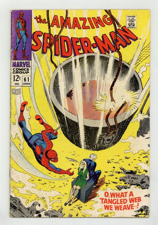 "What a Tangled Web We Weave!" Part 3 of 3. Script by Stan Lee. Art by John Romita (layouts) and Don Heck (pencils). Inks by Mike Esposito (as Mickey Demeo). Cover by John Romita. Gwen Stacy realizes that her father is seriously ill -- plus in danger -- so she takes him to the airport to leave New York City. But the Kingpin's men intercept them in the terminal...and take the pair to their boss' new hideaway -- inside Norman Osborn's chemical plant! After hours of searching, the web-slinger learns where Gwen andCaptain Stacy are being held. And he dashes to their location...for a very personal showdown vs. the Kingpin of Crime! Can the amazing one knock out the Kingpin and save Gwen? Perhaps Norman Osborn (of all people) will lenda hand! Cameo appearances by Mary Jane Watson, Harry Osborn, and J. Jonah Jameson. (Notes: This issue is Gwen Stacy's first cover appearance. This story was reprinted in Marvel Tales #44.) 36 pages. Cover price $0.12. Grade: GD+ 2.5 explanation of grade Condition: Used (collectible)