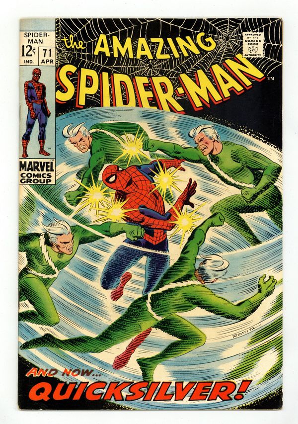 "The Speedster and the Spider!" Guest-starring Quicksilver. Plot by John Romita. Script by Stan Lee. Art by John Romita (layouts) and Jim Mooney (finishes). Cover by John Romita. A downtrodden web-slinger returns to his apartment after losing his temper with J. Jonah Jameson last issue. However Peter Parker's fortunes change the next day when he sells several photographs to the Daily Bugle's stand-in chief (Joe Robertson); and gives the troublesome clay tablet to Captain Stacy. Meanwhile, Quicksilver is back in New York and looking for a way to redeem himself. The mutantspeedster decides that bringing Spider-Man to justice would be the best way. So Pietro launches a surprise attack against the wall-crawler! Quicksilver vs. Spider-Man! May the fastest man win! First appearance of MarthaRobertson. Cameo appearances by Jarvis, Harry Osborn, John Jameson, Betty Brant, Ned Leeds, and Randy Robertson. Flashback cameos by the Scarlet Witch and the Toad. (Notes: Quicksilver and the Scarlet Witch previously appeared in Avengers (1st series) #53. This issue includes a statement of ownership: average print run 556,000; average paid circulation 373,303.) 36 pages. Cover price $0.12. Grade: FN+ 6.5 explanation of grade Condition: Used (collectible)
