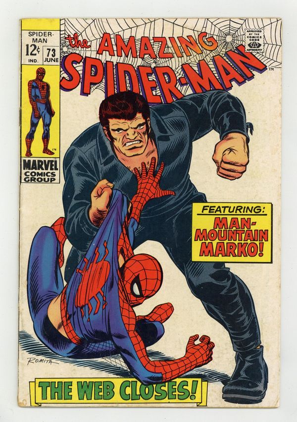 First appearances of Silvermane and Man-Mountain Marko in "The Web Closes!" Plot by John Buscema and John Romita. Script by Stan Lee. Art by John Buscema (layouts) and Jim Mooney (finishes). Cover by John Romita. Spider-Man is in hot pursuit of the ancient clay tablet! And he receives atip from Captain Stacy -- that the Shocker's girlfriend may have it. The wall-crawler rushes to her apartment, but a new super-villain is already there: Man-Mountain Marko! The Maggia sent Marko to get the petrified tablet...and nobody is going to stop him! The web-slinger tries his best,but the raging bull grabs the tablet and takes it to his boss: Silvermane. Why does Silvermane want the tablet? And why does he need Dr. Curt Connors' help? Cameo appearances by Gwen Stacy, Caesar Cicero, Joe Robertson, Randy Robertson, and J. Jonah Jameson. (Notes: The letters page includes letters from comics historian Peter Sanderson and comics writer J.M. DeMatteis, respectively. This story was reprinted in Marvel Tales #54.) 36 pages. Cover price $0.12. Grade: VG+ 4.5 explanation of grade Condition: Used (collectible)