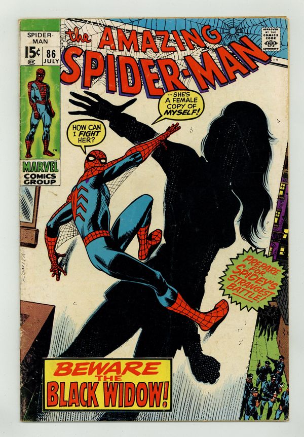First appearance of the Black Widow's classic black costume in "Beware the Black Widow!" Guest-starring the Black Widow. Script by Stan Lee. Art by John Romita (layouts) and Jim Mooney (finishes). Cover by John Romita. Natasha Romanoff is ready to get back in the superhero game! But there are two things she must do first. One...design a new costume; and two...learn the secrets of the wondrous wall-crawler! So to that end the widow lays a trap for the web-slinger! Will the Amazing Spider-Man get caught in the web of the beautiful Black Widow? Retelling of the Black Widow's origin. Cameo appearances by Captain Stacy, Gwen Stacy, Harry Osborn, Aunt May, Anna Watson, and J. Jonah Jameson. Flashback cameos by Iron Man, Hawkeye, and the Red Guardian. (Notes: The Black Widow appears next in Amazing Adventures (1970 2nd series) #1. Spider-Man and the Black Widow meet again in Daredevil (1st series) 103. This issue was reprinted in Marvel Tales #67.) 36 pages. Cover price $0.15. Grade: VG- 3.5 explanation of grade Condition: Used (collectible)