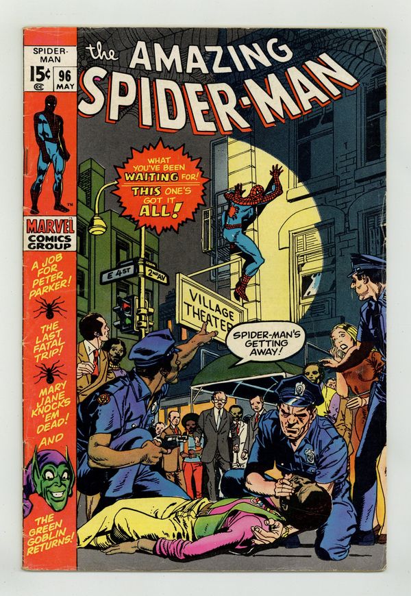 Not approved by the Comics Code Authority (see notes). "And Now, the Goblin!" Part 1 of 3. Script by Stan Lee. Pencils by Gil Kane. Inks by John Romita. Cover by Gil Kane. With Gwen Stacy still in London, Peter Parker gains a new admirer: Mary Jane Watson. Oh boy. How will MaryJane's sudden interest in Peter affect Harry Osborn? Unfortunately, the short answer is not well. Since Harry is secretly battling a drug addiction. Nevertheless, when Mary Jane makes her off-Broadway debut at a local theater; Peter and Harry attend the show to support her. Interestingly, Norman Osborn also attends the musical. In part because he used to own the building that now houses the theater. During the show Norman fixates on a certain door -- possibly a storage room door -- just off the main hallway. And Peter notices it too. After the show the web-slinger returns to the theater...and discovers his worst nightmare in the flesh: the Green Goblin! Wow! Cameo appearances by Joe Robertson and Randy Robertson. (Notes: This three-part story was not approved by the CCA due to the (anti)drug-themed story. At this time the code did not permit drugs to be mentioned in any fashion. However, Stan Lee published the story anyway, and it led to major revisions in the code -- allowing anti-drug stories and horror stories including ones about vampires. The Green Goblin previously appeared in the Spectacular Spider-Man Magazine (1966) #2. Marie Severin provided the layout for the cover. This issue was reprinted in Marvel Tales #77.) 36 pages. Cover price $0.15. Grade: VG 4.0 explanation of grade Condition: Used (collectible)