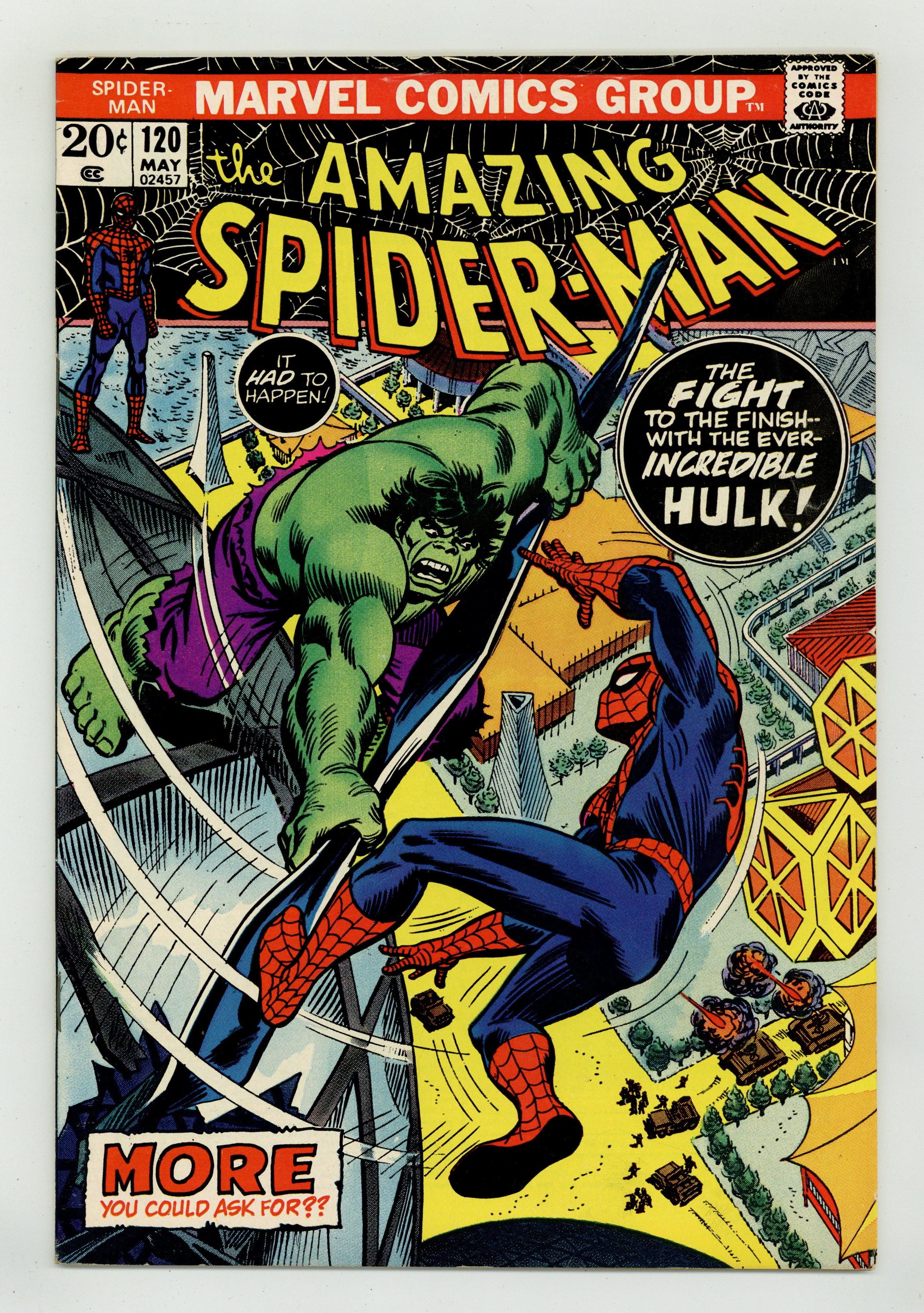"The Fight and the Fury!" Part 2 of 2. Guest-starring the Hulk. Script by Gerry Conway. Pencils by Gil Kane and Paul Reinman (assists). Inks by John Romita, Frank Giacoia, and Tony Mortellaro (backgrounds). Cover by John Romita. The Incredible Hulk has nearly destroyed the Maskattawan Dam near Montreal! So, the wondrous wall-crawler does everything he can to limit the damage downstream! Once the Hulk leaps away, Spider-Man thinks he's done with the Green Goliath. But later that evening at the 1967 World Expo fairgrounds, the web-slinger runs into the Jade Giant again! And this time the Hulk wants to squash Spider-Man for good! Meanwhile back in New York, Harry Osborn suffers a drug relapse -- that will set off a tragic chain of events starting next issue. Cameo appearances by Gwen Stacy and Thunderbolt Ross. (Note: This two-part story was reprinted in Amazing Spider-Man Annual #12.) 36 pages. Cover price $0.20. Grade: FN 6.0 explanation of grade Condition: Used (collectible)