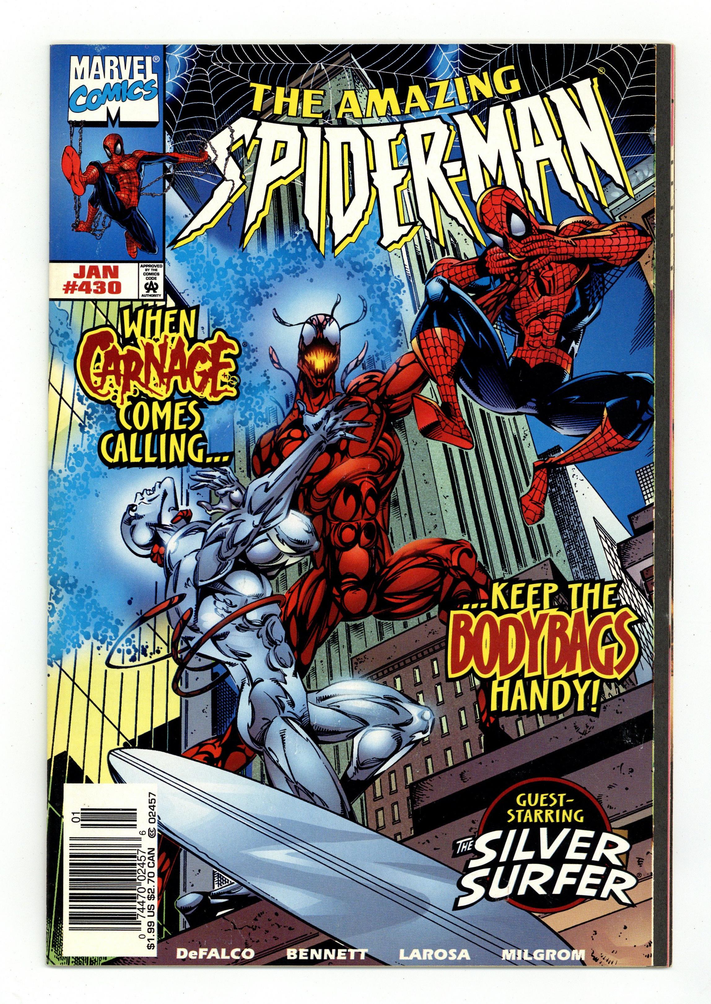 Direct Edition. Cover pencils by Tom Lyle, inks by Bud LaRosa. Carnage and the Silver Surfer guest star in "Savage Rebirth!", script by Tom DeFalco, pencils by Joe Bennett, inks by Bud LaRosa; Spider-Man rejoices that the Avengers have been confirmed to be alive; He begins dealing with the one million dollar reward the Bugle has on him; He heads toward the Baxter Building to visit the Fantastic Four, only to remember that the Thunder Bolts recently purchased the building; Peter agrees to quit being Spider-Man, as Mary meets up with Jill; Dr. Ashley Kafka, the new director of the Ravencroft Institute wants to shut down the microwave field holding back Cletus Kasady in order to cut costs. Cameos by Captain America, Iron Man, and the Vision. 38 pgs., full color. $1.99. Cover price $1.99. Grade: FN- 5.5 explanation of grade Condition: Used (collectible)