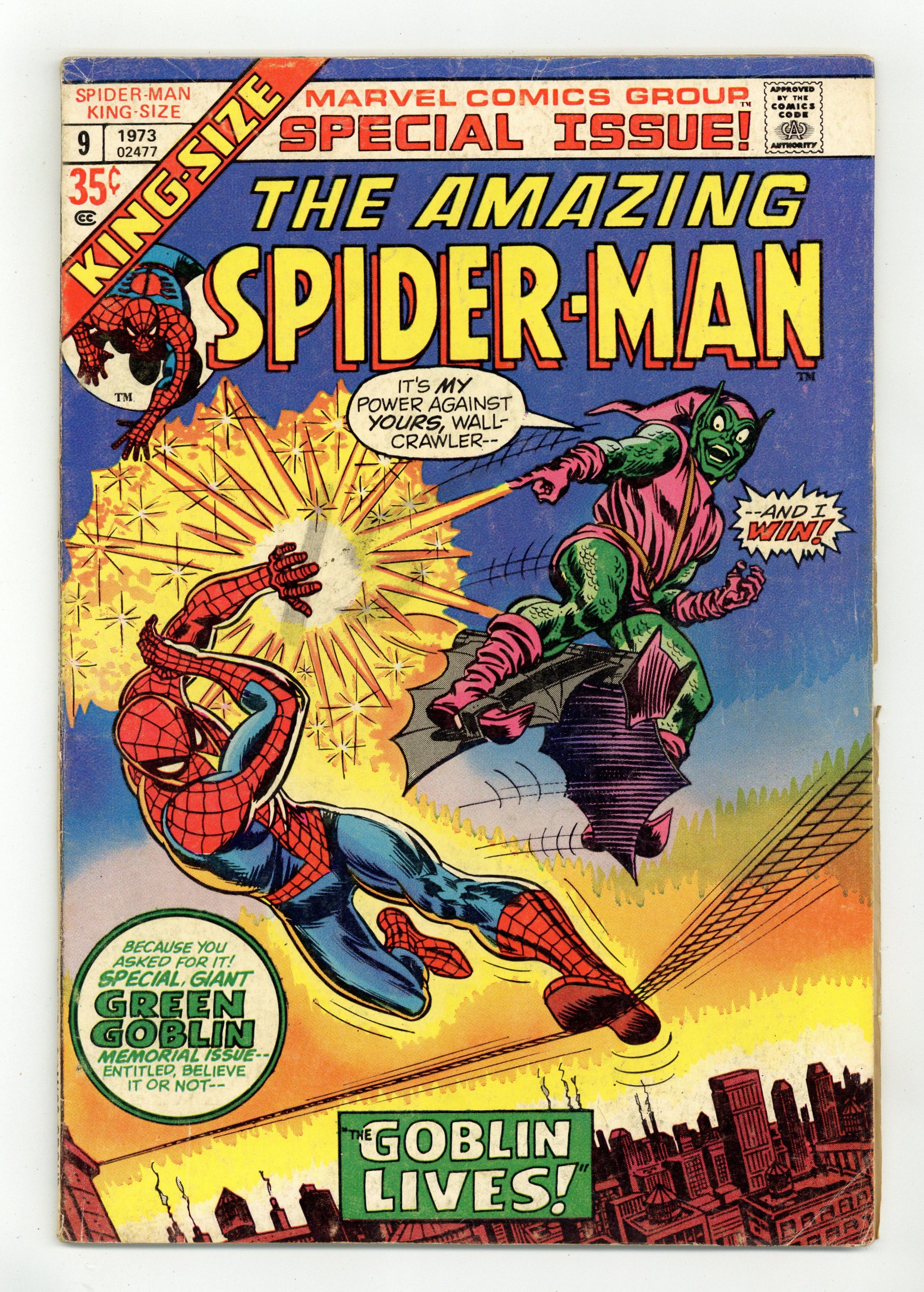 This annual reprints Spectacular Spider-Man (1968 Magazine) #2 in condensed format. "The Goblin Lives!" Script by Stan Lee. Art by John Romita (layouts, pencils), Jim Mooney (pencils, inks) and Frank Giacoia (inks). Redrawn cover by John Romita (from his original painted magazine cover). Norman Osborn relapses and recalls that he is the Green Goblin! Oh no! That is very bad news for the Amazing Spider-Man! The sinister goblin wastes no time in threatening Peter's dear Aunt May! And that quickly drawsthe web-slinger into a terrific no-holds-barred battle with his long-time foe! But this time the wall-crawler turns one of the goblin's tricks against him! Could a psychedelic pumpkin bomb be the key to victory? Cameo appearances by Aunt May, Gwen Stacy, George Stacy, Mary Jane Watson, Harry Osborn, and J. Jonah Jameson. (Notes: 18 pages from the original story are omitted in order to reduce the story to 40 pages to fit the annual format. Missing pages includes numbers 4, 5, 8-11, 17, 21, 23, 24, 27-29, 33, and 36. Elements of the plot briefly cross over with Amazing Spider-Man 66. The Green Goblin previously appeared (chronologically) in Amazing Spider-Man 39-40; and appears next in Amazing Spider-Man 96-98 (the memorable anti-drug issues). 52 pages. 35 cents. Cover price $0.35. Grade: VG- 3.5 explanation of grade Condition: Used (collectible)