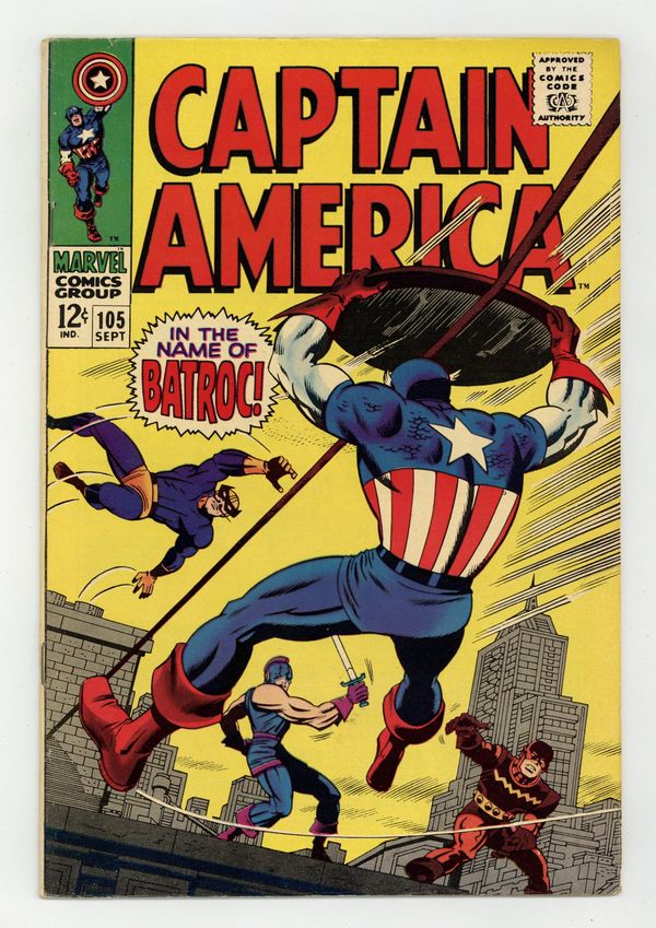 Cover pencils by Jack Kirby and John Romita (alterations), inks by Dan Adkins and John Romita (alterations). "In the Name of Batroc!", script by Stan Lee, pencils by Jack Kirby, inks by Dan Adkins; A television crew invites Captain America to go over some old footage of his battles during World War II; Batroc the Leaper hires the Swordsman and the Living Laser to help him commit a crime; Bucky Barnes flashback. Letter to the editor from comics historian Peter Sanderson Jr. 36 pgs., full color. $0.12. Cover price $0.12. Grade: FN 6.0 explanation of grade Condition: Used (collectible)
