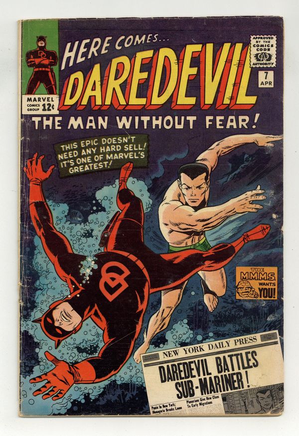 "In Mortal Combat with Sub-Mariner!" Written by Stan Lee. Art and cover by Wally Wood. Namor hires Franklin and Murdock to sue the human race on his behalf. When this doesn't work, he gets himself arrested so he can have his day in court. Realizing humanity won't listen, the Sub-Mariner goes on a rampage which brings Daredevil into the (hopeless) fray. Namor returns to the sea out of respect for DD and to stop Krang from taking over Atlantis. Sub-Mariner/Daredevil pin-up by Wood. Note: First appearance of Daredevil's red costume. 36 pages, full color. Cover price $0.12. Grade: GD+ 2.5 explanation of grade Condition: Used (collectible)