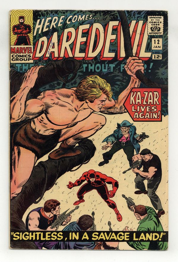 "Sightless, in a Savage Land!" Written by Stan Lee. Pencils byJack Kirby. Inks by John Romita Sr (1st comic work) Cover pencils by John Romita and Jack Kirby (Ka-Zar figure), inks by Vince Colletta and John Romita (retouches). Guest-starring Ka-Zar. Matt decides to take a cruise to get his mind off of Karen. After his cruise ship is boarded by pirates, DD is taken to the Savage Land by the Plunderer. Ka-Zar attacks the Plunderer for trespassing on his domain and saves Daredevil's life as his costume reminds the savage lord of his encounter with the X-Men. Cameos by the Sub-Mariner, the Organizer, Mr. Fear, Ape Man, Bird Man, Cat Man, Frog Man, Stilt-Man, the Matador, and the Owl. Note: First appearance of the Plunderer. Cover price $0.12. Grade: VG+ 4.5 explanation of grade Condition: Used (collectible)