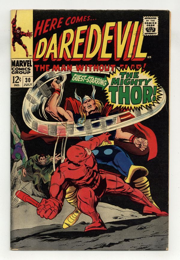 "If There Should Be a Thunder God" Written by Stan Lee. Pencils by Gene Colan. Inks by John Tartaglione. With Cobra and Hyde on the loose, Matt decides to dress up like their prime antagonist, the mighty Thor, to draw them out; The real thunder god takes umbrage at being impersonated and battles DD; After proving that he is verily worthy, DD tangles with Cobra and Hyde and has his super-powered senses stolen by one of Hyde's formulas, making him truly blind. House ad for the first issue of Not Brand Echh. Ad for the Merry Marvel Marching Society. Cover by Gene Colan with inks by John Tartaglione. Cover price $0.12. Grade: VG/FN 5.0 explanation of grade Condition: Used (collectible)