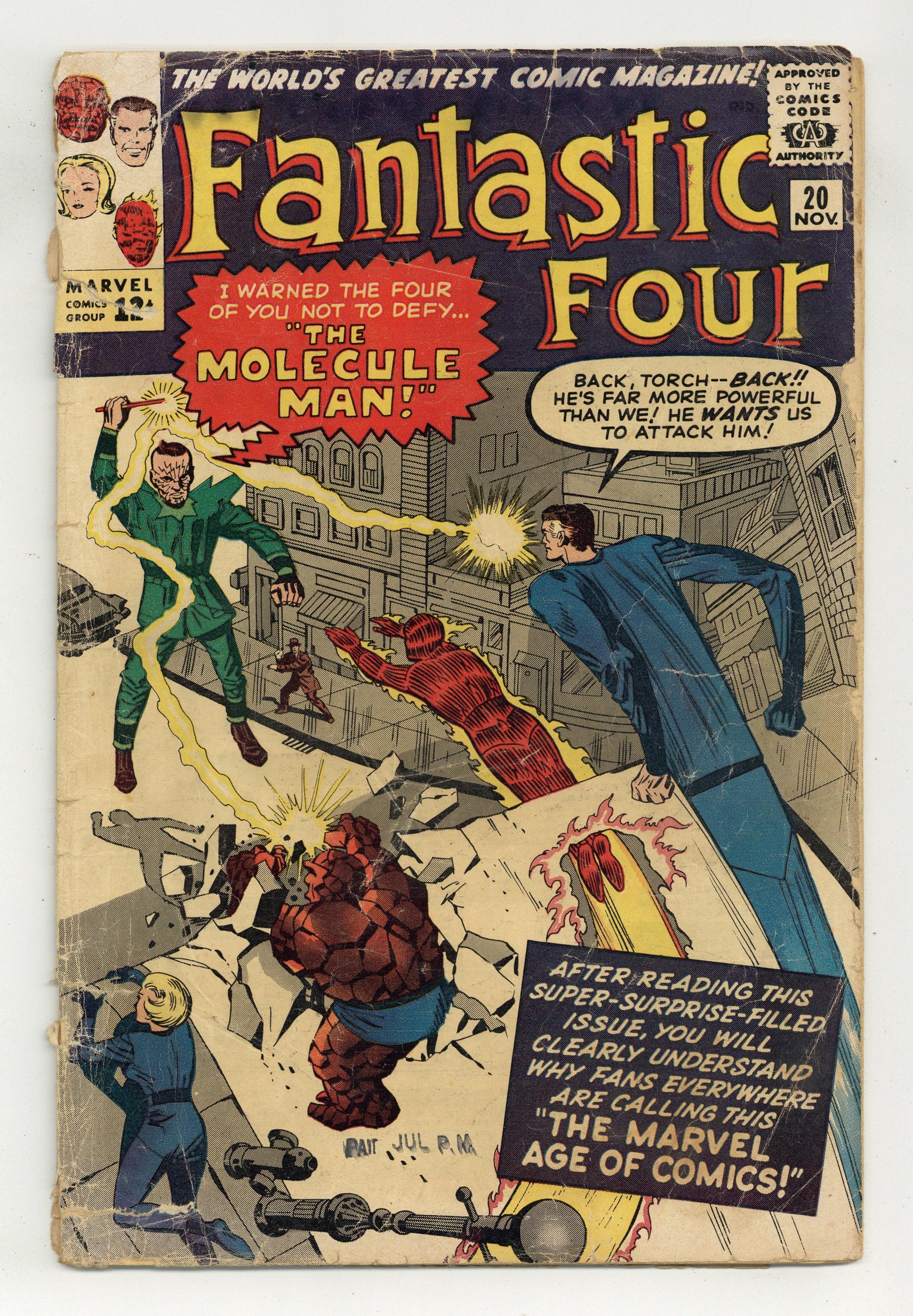 Cover pencils by Jack Kirby, inks by George Roussos. Origin and first appearance of the Molecule Man in "The Mysterious Molecule Man!", script by Stan Lee, pencils by Jack Kirby, inks by Dick Ayers; The Watcher asks the Fantastic Four to stop a new menace who could destroy the whole universe: the Molecule Man. House ad for Tales To Astonish #49, art by Don Heck. The letters page contains a letter to the editor from George R. R. Martin, best known for the series 'A Song of Ice and Fire,' which HBO's 'A Game of Thrones' is based on (his first time published in print!), as well as a letter from then 10-year-old Mark Gruenwald, who identifies himself as the secretary of the Fantastic Four Fan Club (the Oshkosh contingent, anyway). Cover price $0.12. Grade: PR 0.5 explanation of grade Condition: Used (collectible)