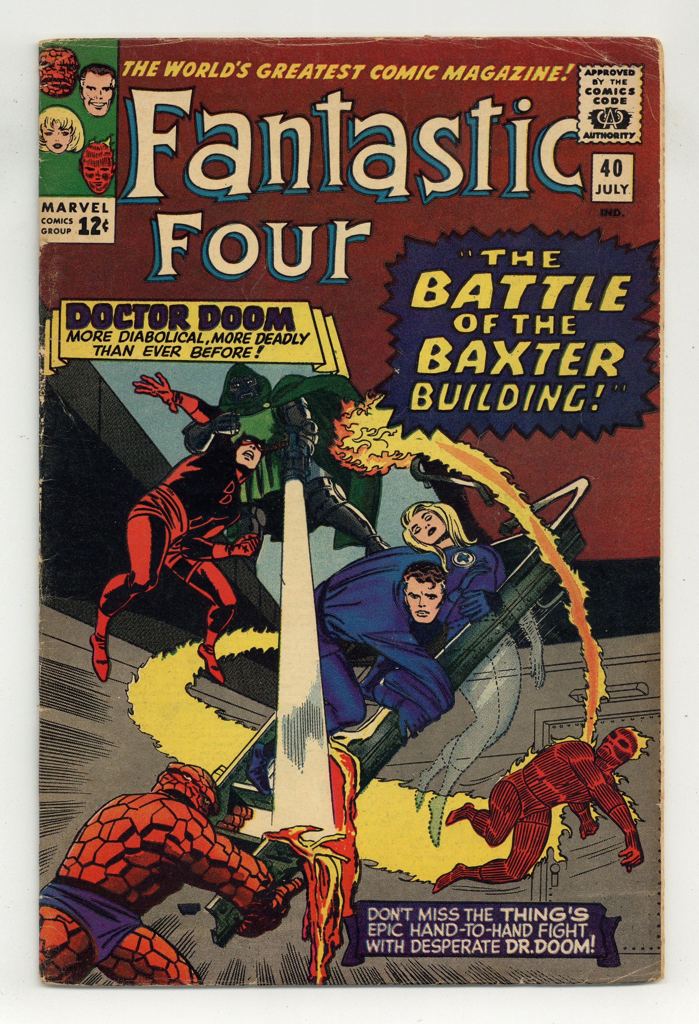 Cover pencils by Jack Kirby, inks by Frank Giacoia. The Battle of the Baxter Building, script by Stan Lee, pencils by Jack Kirby, inks by Vince Colletta; Dr. Doom battles the FF and Daredevil; Reed restores the FF's powers. 36 pgs. $0.12. Cover price $0.12. Grade: VG 4.0 explanation of grade Condition: Used (collectible)