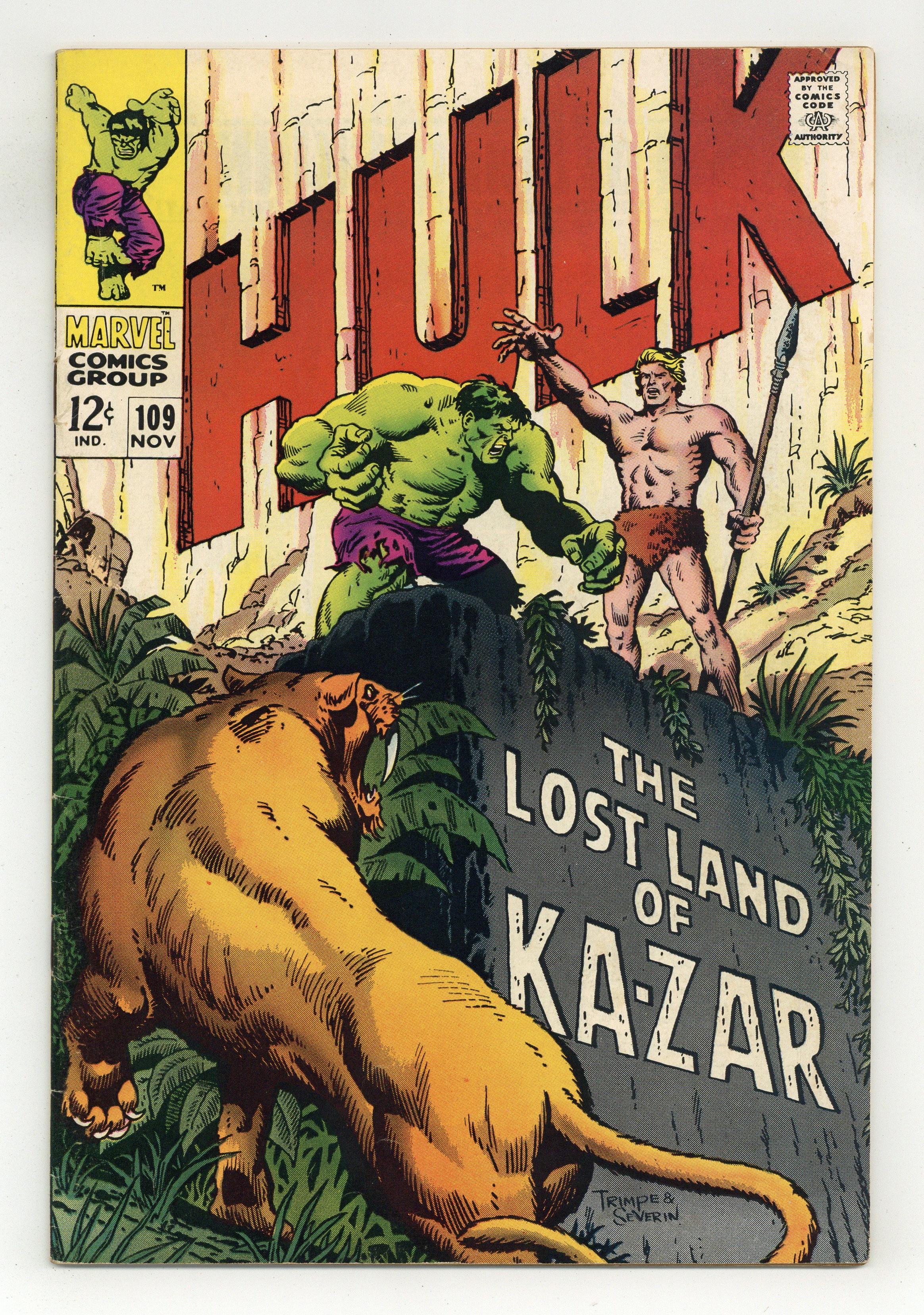 Cover pencils by Herb Trimpe, inks by John Severin. The Monster and the Man-Beast!, script by Stan Lee, pencils by Frank Giacoia (layouts) and Herb Trimpe, inks by John Severin; The Hulk stops a deadly Chinese missile from being launched but the huge detonation drops him into the Savage Land where he transforms back into Bruce Banner; Being rescued by Ka-Zar from the Swamp Men, the jungle lord asks for Banner's help in deactivating a mysterious machine that is making weather all over the world to go wild and will eventually lead to the destruction of earth; The Swamp Men renew their attack and Banner becomes the Hulk to face the threat, totally forgetting about the deadly machine he was supposed to deactivate. Letter to the editor from future pro Tony Isabella. 36 pgs. Cover price $0.12. Grade: VG/FN 5.0 explanation of grade Condition: Used (collectible)