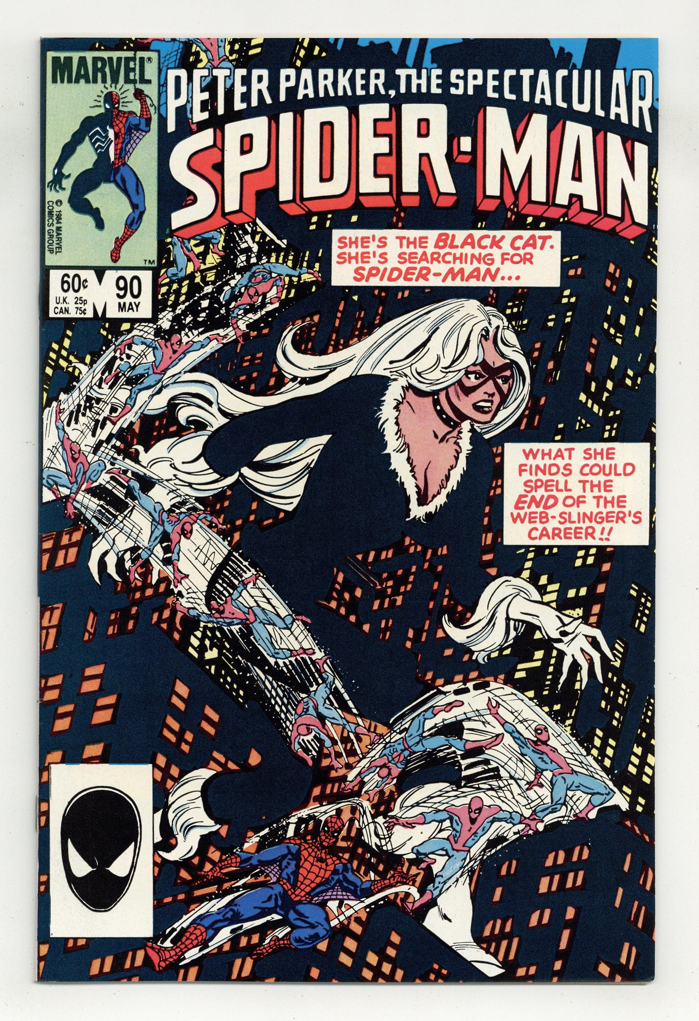Direct Edition. "Where, Oh Where Has My Spider-Man Gone?" Script and Pencils by Al Milgrom. Inks by Jim Mooney. Cover by Al Milgrom. The Spectacular Spider-Man is missing! Where is he? The Black Cat is looking everywhere! She checks with everyone including Mrs. Muggins, Captain DeWolff, J. Jonah Jameson, Aunt May, and the Avengers! When the web-slinger finally reappears on the final page, he's wearing his new black costume! Cameo appearances by the Vision and the Scarlet Witch. (Notes: Spider-Man's new costume debuted this month in Amazing Spider-Man 252, Marvel Team-Up 141, and this issue. The letters page includes a statement of ownership: average print run 351,448; average paid circulation 172,290.) 32 pages Cover price $0.60. Grade: VF+ 8.5 explanation of grade Condition: Used (collectible)