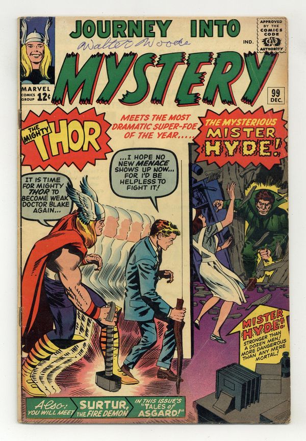Cover pencils by Jack Kirby, inks by George Roussos. First appearance of Mr. Hyde in "The Mysterious Mister Hyde!", script by Stan Lee, art by Don Heck; Having been refused a job by Doctor Blake, Calvin Zabo becomes Mister Hyde and attacks the doctor; Meanwhile, Odin has agreed to let Thor marry Jane Foster if she proves worthy. "The Thread" text story. "Stroom's Strange Solution!", script by Stan Lee (plot) and Larry Lieber (script), pencils by Larry Lieber, inks by Matt Fox; An alien world is dangerously overpopulated, so a scientist releases a gas that shrinks the entire population, making the same amount of space accommodate more people. Third "Tales of Asgard" installment, "Surtur the Fire Demon!, script by Stan Lee, pencils by Jack Kirby, inks by George Roussos; The Trolls ally with Surtur against Asgard, but Odin conquers them; Surtur travels to Earth to destroy it. 36 pgs., full color. $0.12. Cover price $0.12. Grade: GD 2.0 explanation of grade Condition: Used (collectible)