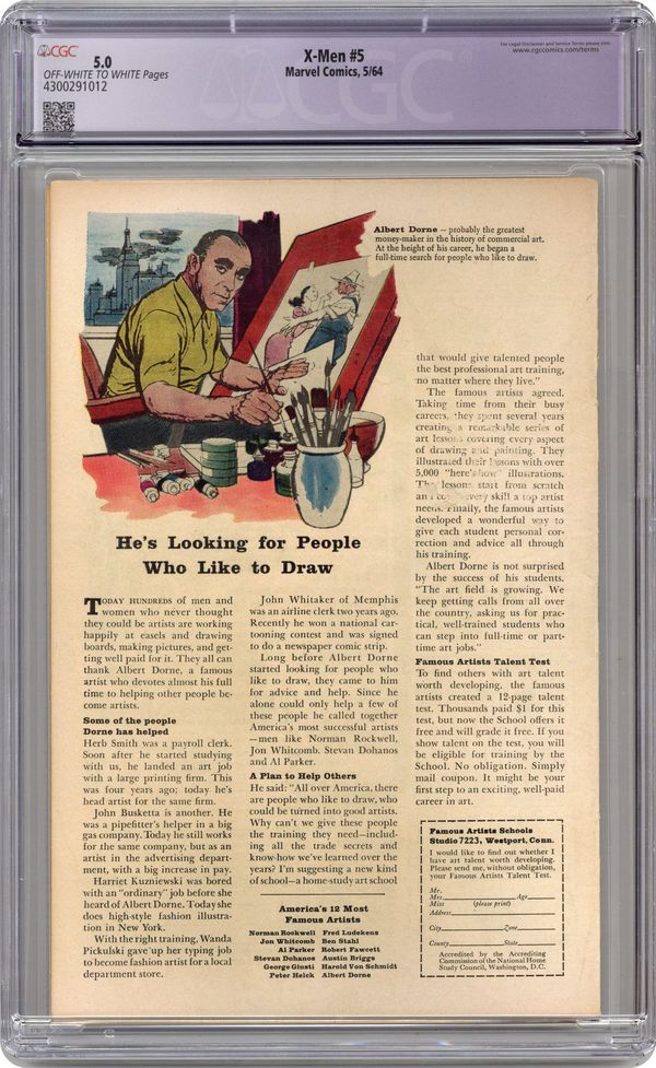 Ended Oct 12 2023 Winning Bid $142 Cover pencils by Jack Kirby, inks by Paul Reinman and Marie Severin (Angel alterations). Trapped: One X-Man!, script by Stan Lee, pencils by Jack Kirby, inks by Paul Reinman; With Xavier's mental powers gone, the X-Men try to decide how they will function without his leadership; Trying to ferret out the X-Men, Magneto has the Toad enter an atheletic event where he leaps to victory; With the crowd turning hostile due to the Toads amazing abilities, the X-Men arrive on the scene to capture him; Magneto snags Angel and whisks him away to Asteroid M; In an attempt to trade the Toad for Angel, the X-Men arrive on Asteroid M where they battle the Brotherhood once again; On their safe return to earth, Xavier revels that his power loss was a ruse to test his students. First Appearance of Magneto's Asteroid M; Prof's loss of powers just a test. Letter column begins in this issue. 36 pgs. $0.12. Cover price $0.12. Grade: CGC 5.0 explanation of grade Condition: Used (collectible)