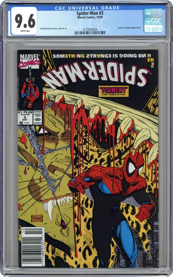 Ended Oct 16 2023 Winning Bid $17 Direct Edition. Torment Part 3 of 5. "Something Strange is Going on Here!" Script and art by Todd McFarlane. Cover by Todd McFarlane. The Amazing Spider-Man and the Lethal Lizard wage war across the rooftops of Manhattan! Until the mysterious drums halt their fight! Who is controlling the pounding drums? The web-slinger better find out soon...or he won't make it through the night in one piece! Cameo appearance by Mary Jane Watson. (Note: This five-part story was reprinted in 1992 in the trade paperback: Spider-Man Torment; and again in 2009 in hardcover format.) 32 pages. Cover price $1.75. Grade: CGC 9.6 explanation of grade Condition: Used (collectible)