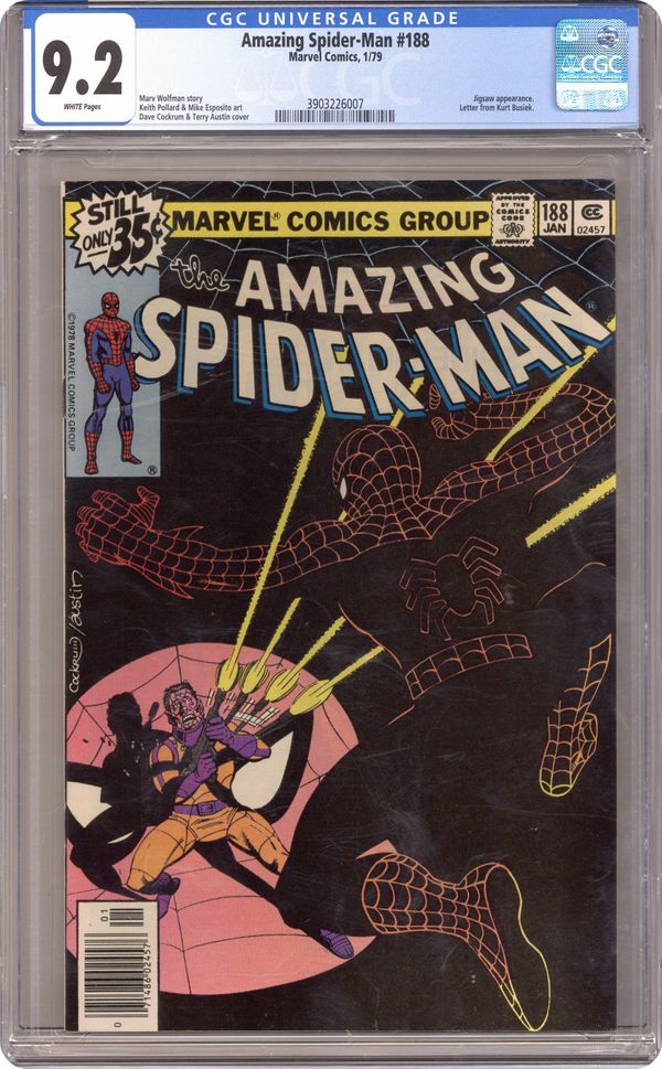 "The Jigsaw is Up!" Script by Marv Wolfman. Art by Keith Pollard (layouts) and Mike Esposito (finishes). Cover by Dave Cockrum and Terry Austin. After laying low for a few months, Jigsaw wants to return to a peaceful life of crime...by avoiding any and all super-heroes! So the disfigured hitman picks an easy target for his next caper: a midnight boat cruise around Manhattan! But poor Jigsaw doesn't know that a group of long-time friends have decided to take the boat ride too! Namely Flash, Sha Shan, Harry, Liz, Mary Jane, Betty, and Peter! Once Jigsaw grabs Harry and Liz at gunpoint, the wondrous wall-crawler swings into action! And Jigsaw's worst nightmare comes true: another clash with the Spectacular Spider-Man! Cameo appearances by John Jameson and Aunt May. (Notes: Jigsaw formerly appeared in Amazing Spiderman 162 and returns in the first issue of the Punisher Limited Series (1986). The letters page includes a lengthy letter from comics writer Kurt Busiek.) 36 pages Cover price $0.35. Grade: CGC 9.2 explanation of grade Condition: Used (collectible)