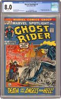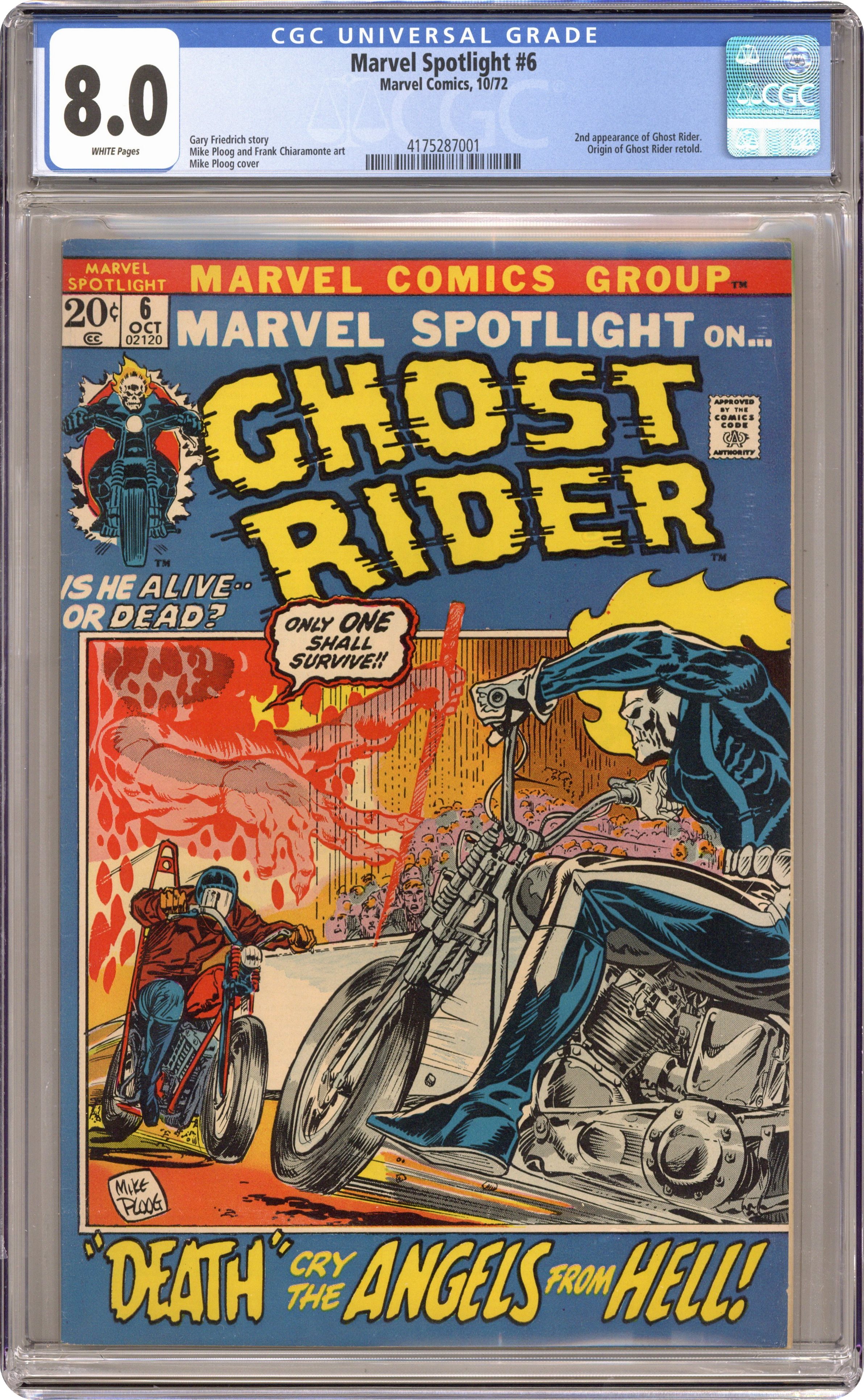 Cover art by Mike Ploog. Angels From Hell, script by Gary Friedrich, pencils by Mike Ploog, inks by Frank Chiaramonte; Ghost Rider battles a gang of bikers called Satans Saints; after GR defeats them, their leader asks him to join the club; 2nd appearance of Ghost Rider (origin retold). 36 pages, full color. Cover price $0.20. Grade: CGC 8.0 explanation of grade Condition: Used (collectible)