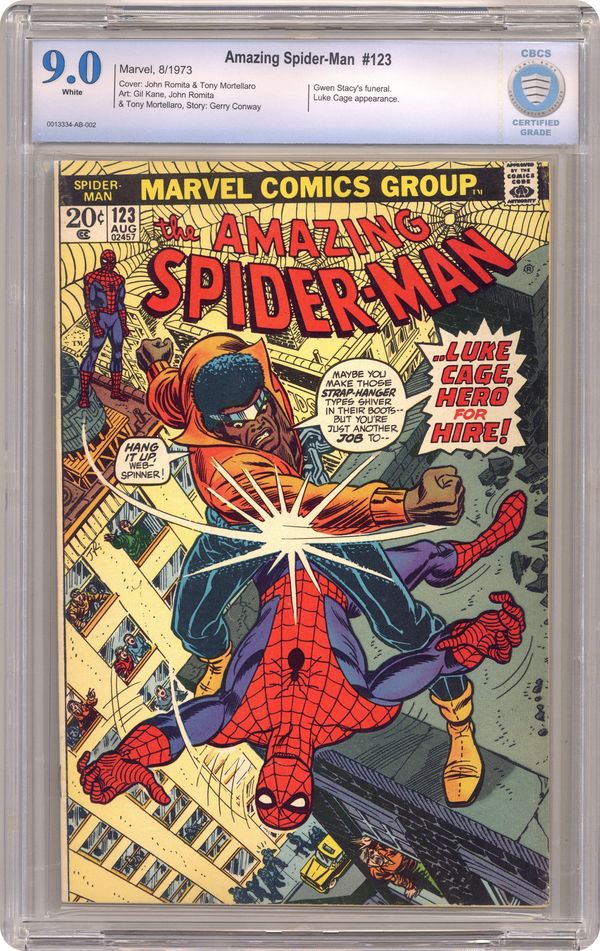 Ended Dec 18 2023 Winning Bid $100 "...Just A Man Called Cage!" Guest-starring Luke Cage. Script by Gerry Conway. Pencils by Gil Kane and John Romita. Inks by John Romita and Tony Mortellaro (backgrounds). Cover by John Romita and Tony Mortellaro. While Peter Parker and his friends attend Gwen Stacy's funeral, J. Jonah Jameson plots revenge against the web-slinger for the death of Norman Osborn. The Daily Bugle publisher wants the wall-crawler captured dead or alive -- and he hires the powerful Luke Cage to do it! On a Manhattan rooftop, the Hero for Hire ambushes Spider-Man! And the super slugfest begins! The two heroes trade punches, body blows, and haymakers one after another! How will they break the stalemate -- before they break each other in half? Cameo appearances by Mary Jane Watson, Harry Osborn, Betty Brant, Joe Robertson, Flash Thompson, Anna Watson, Aunt May, and Norman Osborn (deceased). (Notes: This issue features the first meeting between Spider-Man and Luke Cage. The plot crosses over briefly with Power Man and Iron Fist (1972 Hero for Hire) #12. This story was reprinted in Marvel Tales 100.) 36 pages. Cover price $0.20. Grade: CBCS 9.0 explanation of grade Condition: Used (collectible)