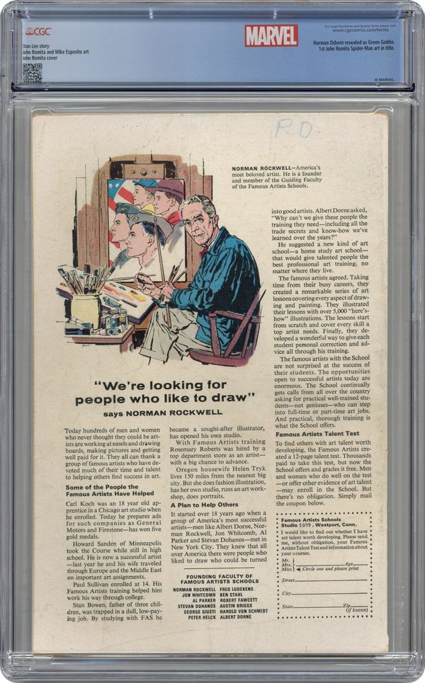 Ended Feb 6 2024 Winning Bid $195 Cover art by John Romita. How Green Was My Goblin!, script by Stan Lee, pencils by John Romita (who begins as regular penciler), inks by Mike Esposito [as Mickey Demeo] and John Romita (touch-ups); Peter heads to the doctor with the sniffles and learns that Aunt May's health is very fragile; Spidey is roped into tangling with a bunch of goons who zap him with a mysterious gas; Not realizing that the gas has weakened his spider sense, he changes into Peter Parker under the watchful gaze of the Green Goblin; The Goblin confronts Spidey outside of his home and captures him as Peter is worried that Aunt May might be overcome by the commotion; Trussed up in the Goblin's lair, Peter is shocked when the Goblin takes off his mask and reveals himself to be Norman Osborn. Reprinted in Marvel Tales # 178. According to Les Daniels in "Marvel: Five Fabulous Decades of the World's Greatest Comics" (Abrams, 1991), artist Steve Ditko resigned because of a disagreement over the Goblin's identity. Ditko wanted it to be someone anonymous--a new, unknown guy; Lee wanted it to be a familiar character that would startle readers. 36 pgs. $0.12. Cover price $0.12. Grade: CGC 4.5 explanation of grade Condition: Used (collectible)