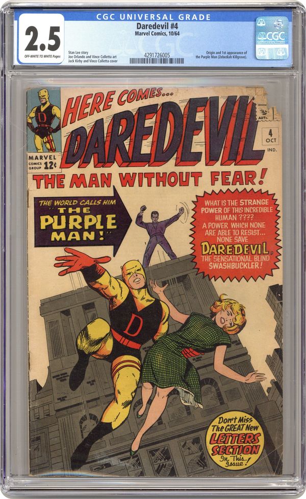 Ended Oct 14 2023 Winning Bid $77 Cover pencils by Jack Kirby, inks by Vince Colletta. First appearance of the Purple Man in Killgrave, the Unbelievable Purple Man!, script by Stan Lee, pencils by Joe Orlando, inks by Vince Colletta; DD runs up against a purple man who can make anyone do what he wants just by suggesting it. First letters page. 36 pgs. Cover price $0.12. Cover price $0.12. Grade: CGC 2.5 explanation of grade Condition: Used (collectible)
