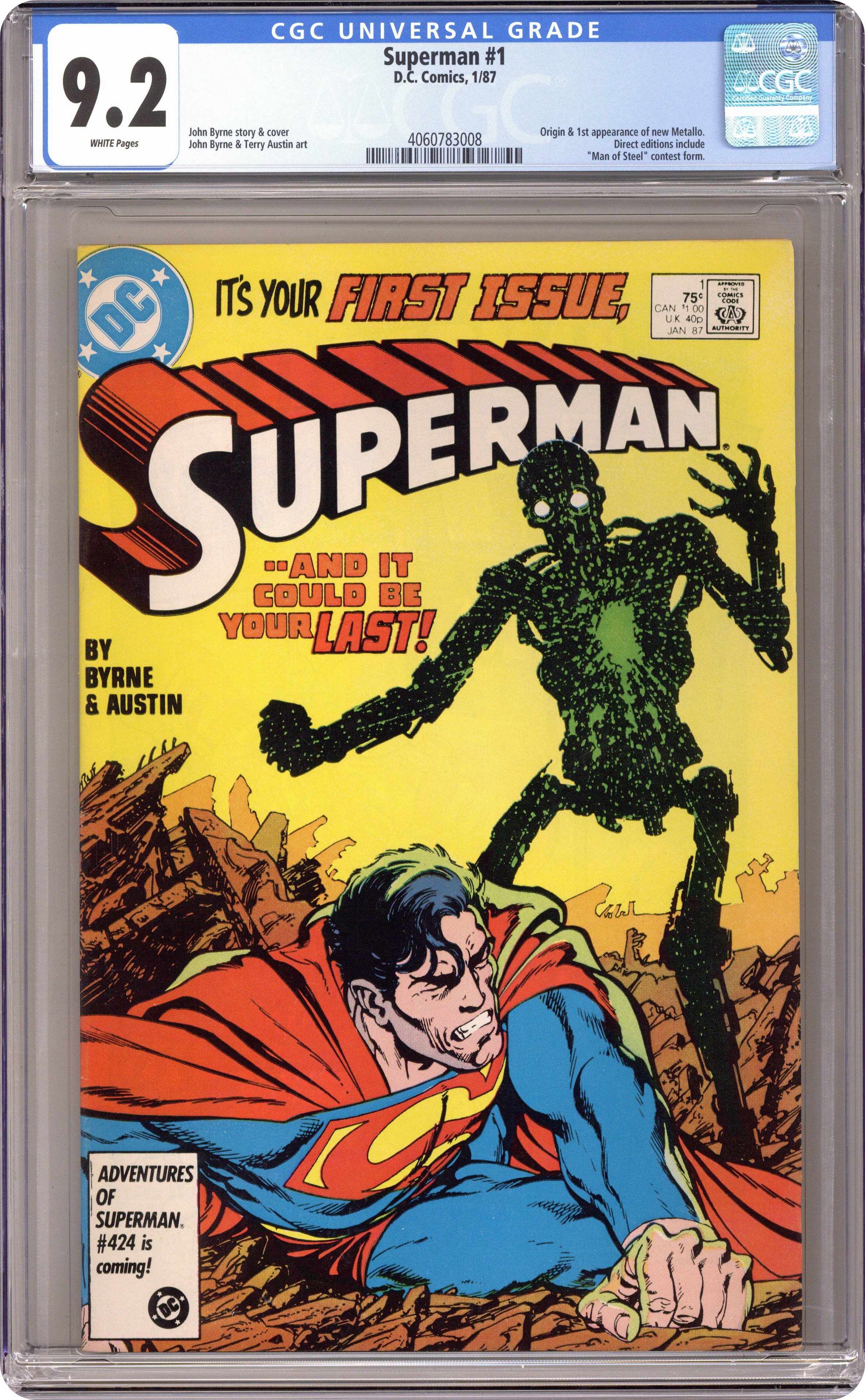 Ended Oct 3 2023 Winning Bid $25 Direct Edition. "Heart of Stone!" Story by John Byrne. Art by John Byrne and Terry Austin. In the wake of Crisis on Infinite Earths, DC decides to revamp and reinvigorate their universe, and their heroes. First up, why none other than the Man of Steel himself. Superstar John Byrne, known for his acclaimed work on Marvel's Uncanny X-Men and the Fantastic Four, re-imagines the Last Son of Krypton for a whole new generation. However, Superman's first issue in this historical relaunch just may be his last as he comes face-to-face with Metallo, the Man with the Kryptonite Heart! Featuring Lois Lane. NOTE: Also see Man of Steel (1986) #1-6 for the lead in story to this series. Superman was created by Jerry Siegel and Joe Shuster. Cover price $0.75. Grade: CGC 9.2 explanation of grade Condition: Used (collectible)