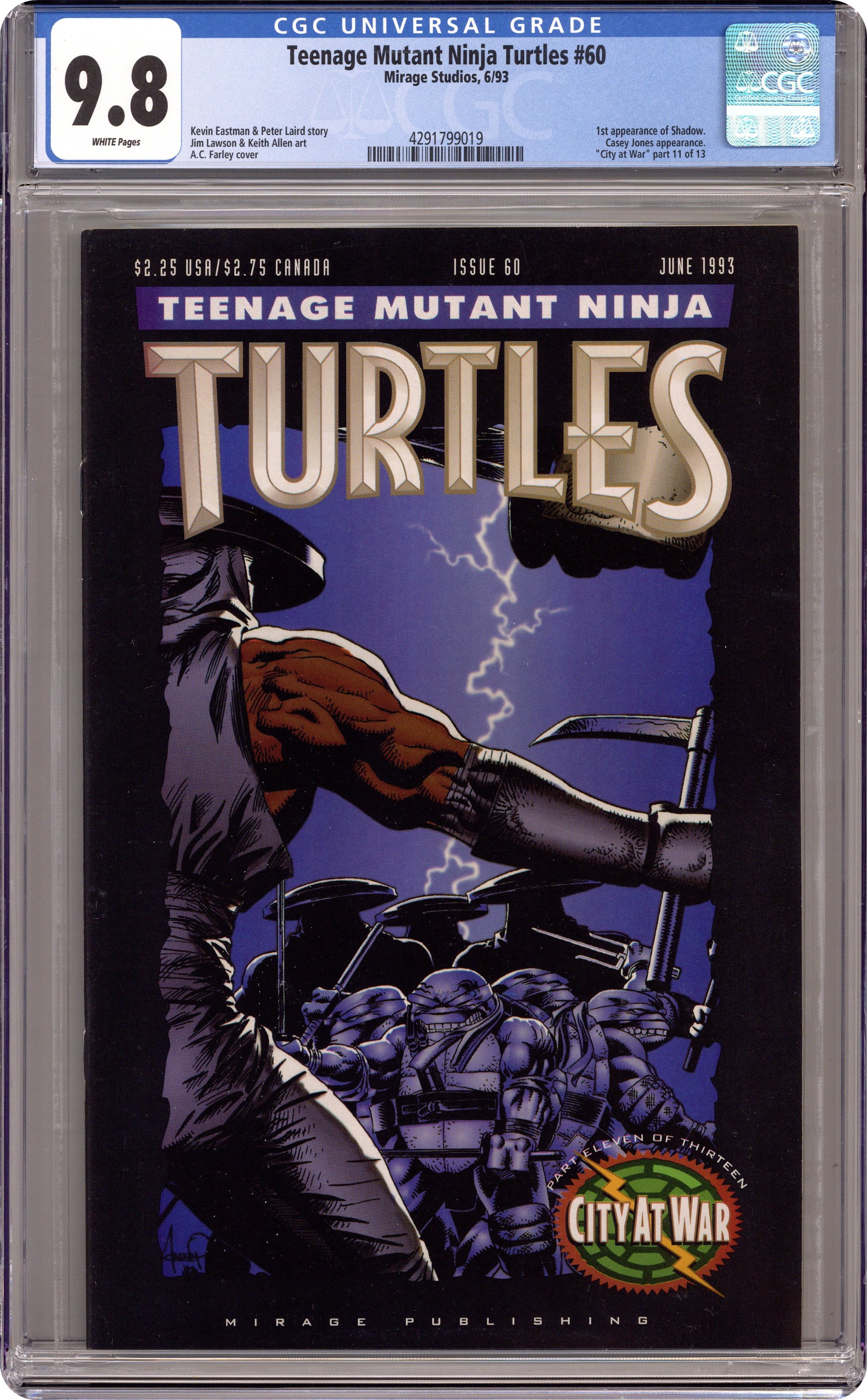 City At War, Part 11. Karai and the Turtles face down the Elite. Story by Kevin Eastman, Peter Laird and Jim Lawson; art by Lawson. Black and white; 32 pages. Cover by A.C. Farley. Cover price $2.25. Cover price $2.25. Grade: CGC 9.8 explanation of grade Condition: Used (collectible)