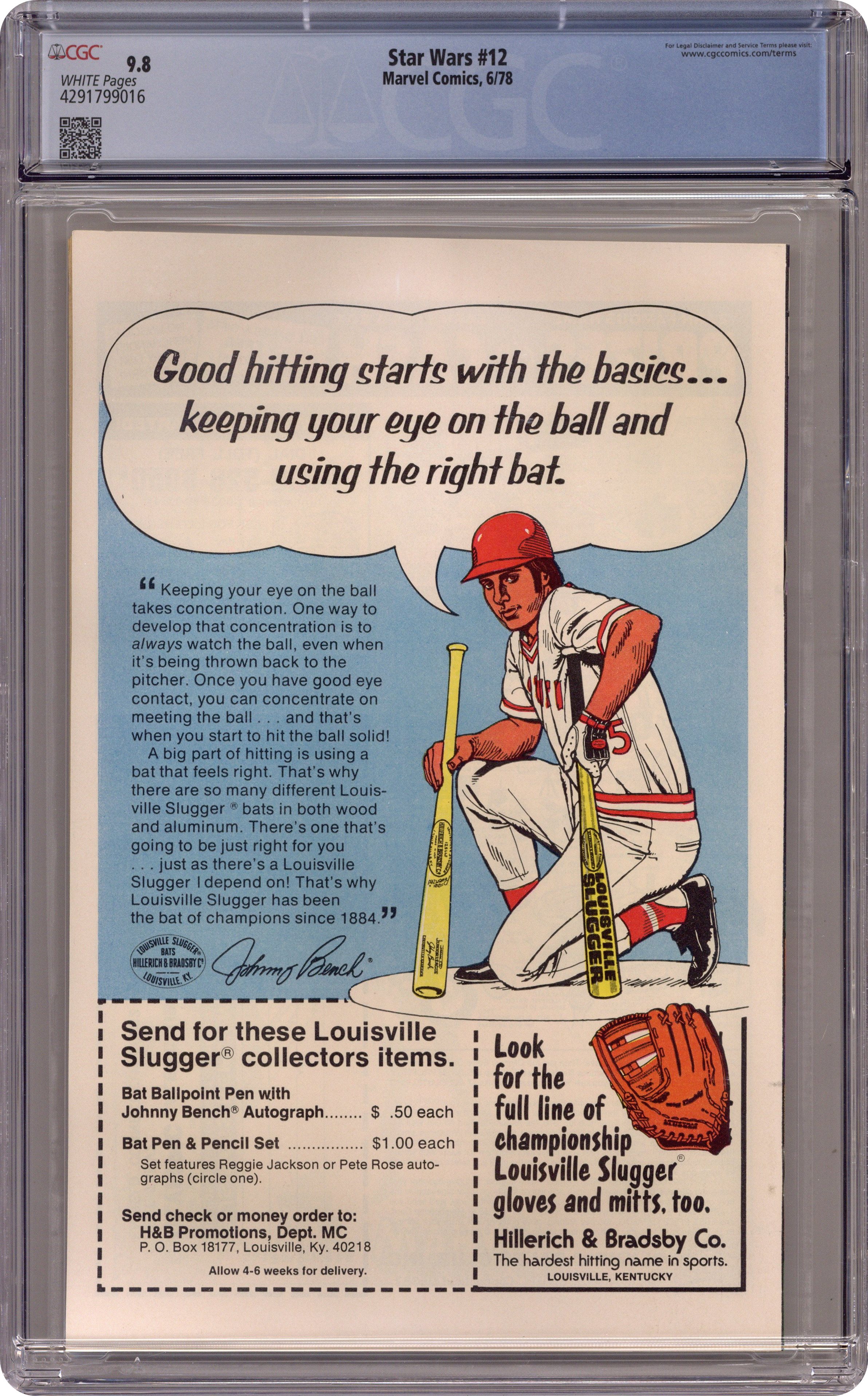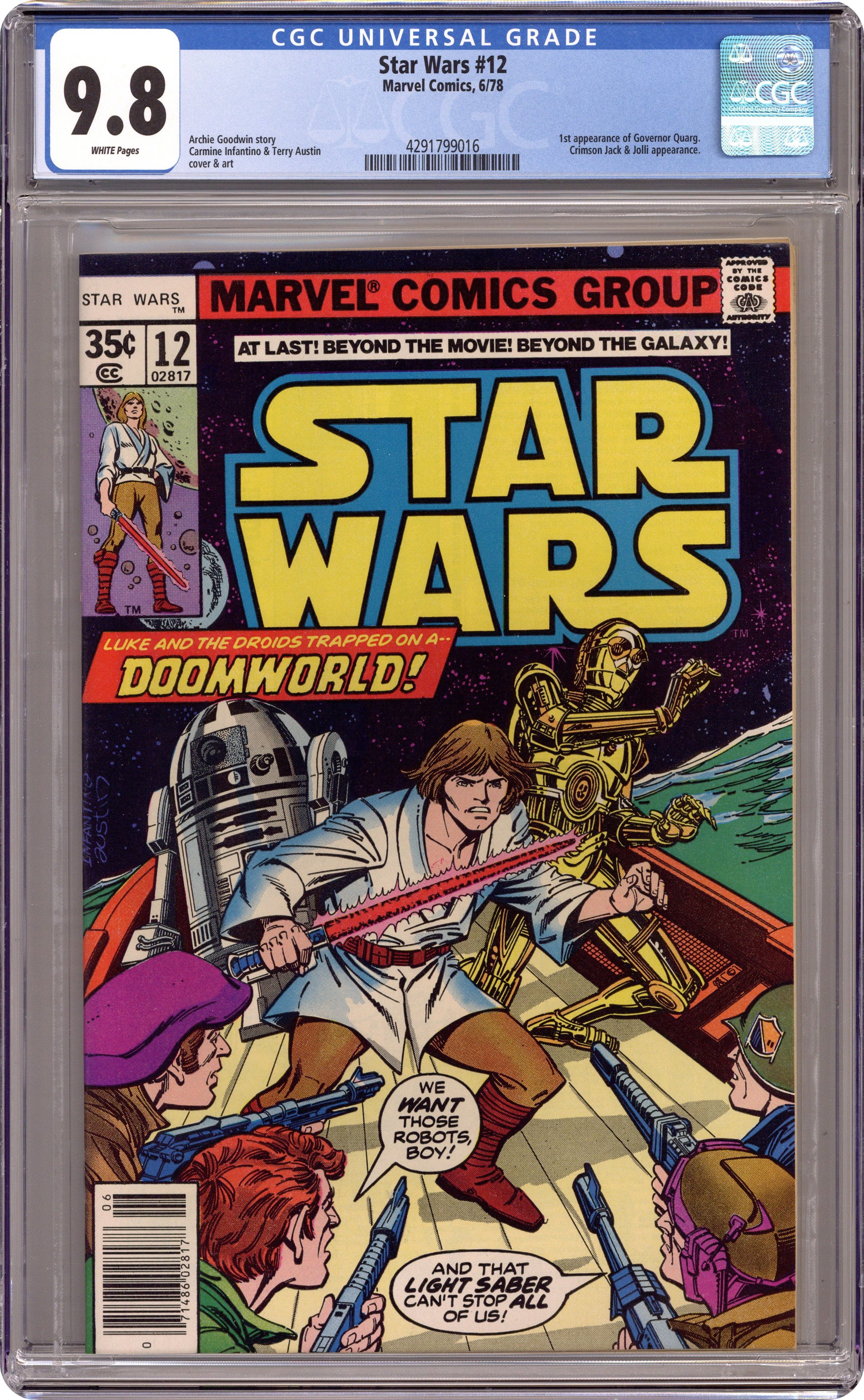 "Doomworld!" Written by Archie Goodwin. Art by Carmine Infantino and Terry Austin. While searching for a new location of the Rebel's set up shop, Luke Skywalker crash landed on a dangerous world of death and betrayal. Can this young hero hope to survive on Doomworld? Meanwhile, Han Solo attempts to bluff Crimson Jack, one of the galaxy's deadliest space pirates. Cover price $0.35. Grade: CGC 9.8 explanation of grade Condition: Used (collectible)