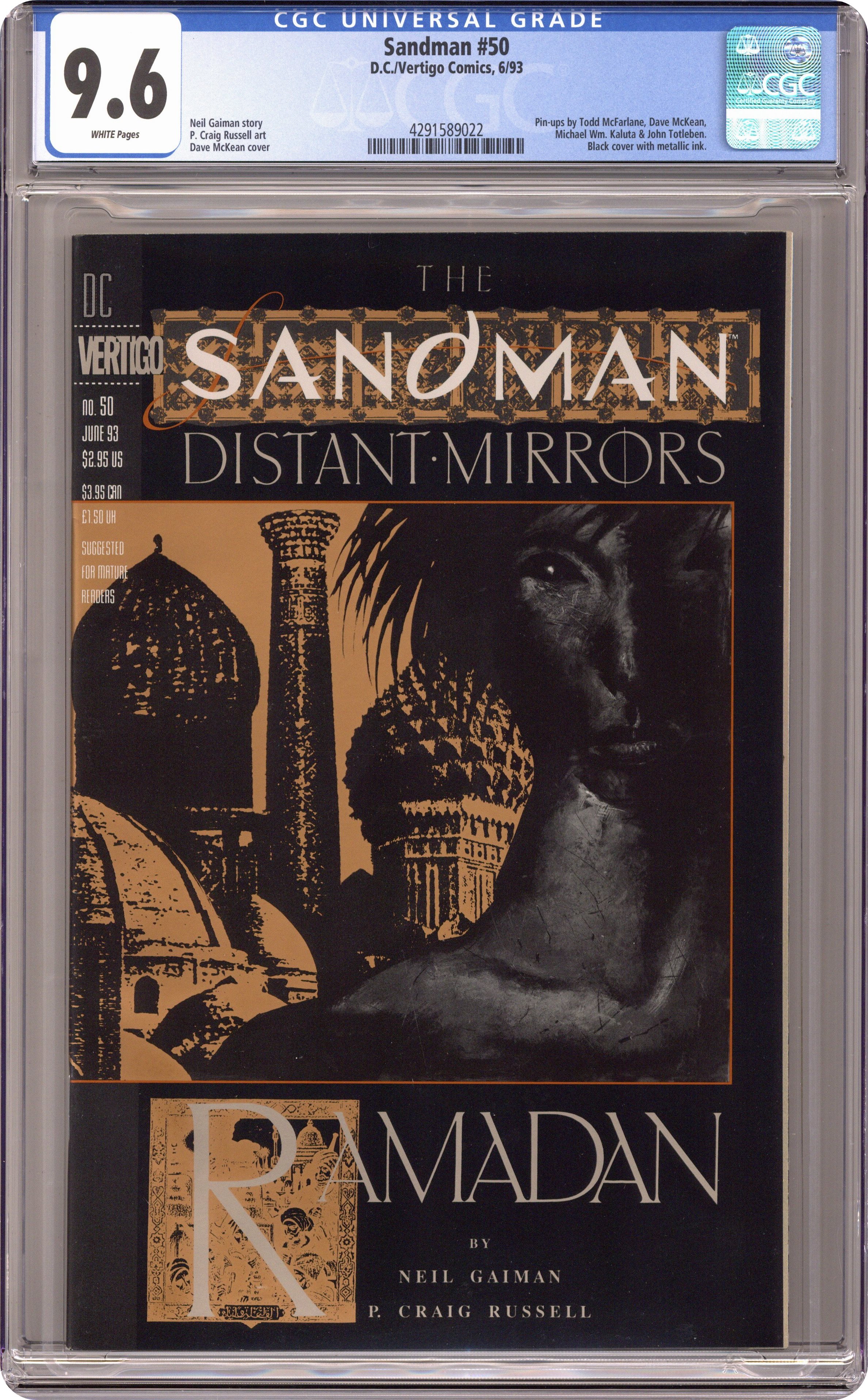 His name was Haroun Al Raschid, King of Kings, Prince of the Faithful, and he was the Caliph of Baghdad when it was the Jewel of Arabia. The ruler of a vast empire, he gathered around him the finest men, the loveliest women and the wiliest magicians in his domain. Haroun Al Raschid was a good ruler and wise, but he knew a great secret, one that left a black stain on his heart. There was one thing he desired that he could not possess - immortality, though not for himself - and there was only one who could grant it to him - the Lord of Dreams. In "Ramadan," the 50th issue of THE SANDMAN, Neil Gaiman and P. Craig Russell collaborate to tell a fabulous tale straight out of the Arabian Nights, the story of a Palace of Wonders and one of the myriad ways that a dream can be born. Drawing on both centuries-old myths and yesterday's news, Gaiman has composed a bitter-sweet fable about fables. Russell's finely detailed renderings give life to Gaiman's vision of a glorious, mythical past. This 48-page celebration also features an exclusive gallery of interpretations of the Sandman by Todd McFarlane, Dave McKean, Scott McCloud, Michael Kaluta, John Totleben, Michael Zulli and Jill Karla Schwartz. The wraparound black cover with multiple metallic inks is by McKean. Suggested for Mature Readers. New Format. Cover price $2.95. Grade: CGC 9.6 explanation of grade Condition: Used (collectible)