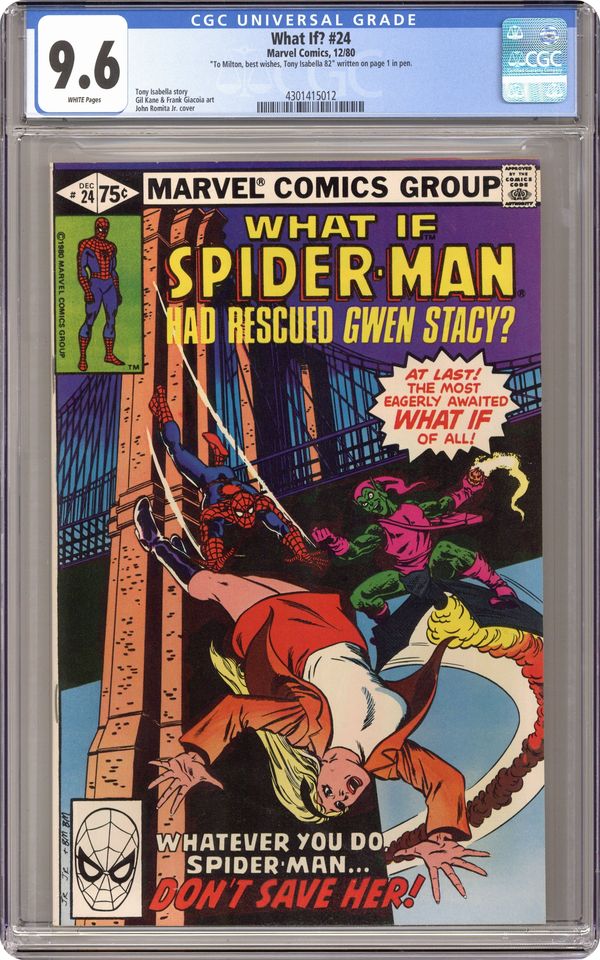 Ended Oct 11 2023 Winning Bid $41 Direct Edition. "What If... Gwen Stacy had Lived?" Script by Tony Isabella. Art by Gil Kane (breakdowns), Frank Giacoia (finishes), Carl Gafford (assists), Peter Poplaski (assists), Ron Zalme (assists), and Joe Albelo (assists). Cover by John Romita Jr. and Bob McLeod. In the landmark story in Amazing Spider-Man 121 & 122, Gwen Stacy died during Spider-Man's heroic battle vs. the Green Goblin atop the Brooklyn Bridge. Many times since both the web-slinger and his fans have wondered how different Peter Parker's life would have turnedout if Gwen had lived. In this issue the Watcher presents an alternate reality in which Spider-Man saves Gwen. After the Green Goblin knocks Gwen off the bridge, the wall-crawler jumps from the support column to catch her with his arms instead of his webbing! And in spectacular fashion, Spider-Man grabs his girlfriend before they hit the water! Upon returning to safe ground, Peter proposes... and Gwen accepts! Later on the web-spinner tracks down the Green Goblin and (with help from Harry) convinces him to surrender! Everything is going great for the Amazing Spider-Man! Several weeks later Peter and Gwen exchange wedding vows! But at the end of their ceremony, J. Jonah Jameson barges in with breaking news! Very damning news for one Peter Parker! As the cover caption forewarns... sometimes the past is best left in the past. Cameo appearances by Joe Robertson, Flash Thompson, Betty Brant, Ned Leeds, and Aunt May. Backup story: "The First Eternals!" Script by Ralph Macchio. Art by Rich Buckler (breakdowns) and Chic Stone (finishes). (Note: Both stories were reprinted in 2007 in the trade paperback: What If? Classic 4.) 52 pages. Cover price $0.75. Grade: CGC 9.6 explanation of grade Condition: Used (collectible)