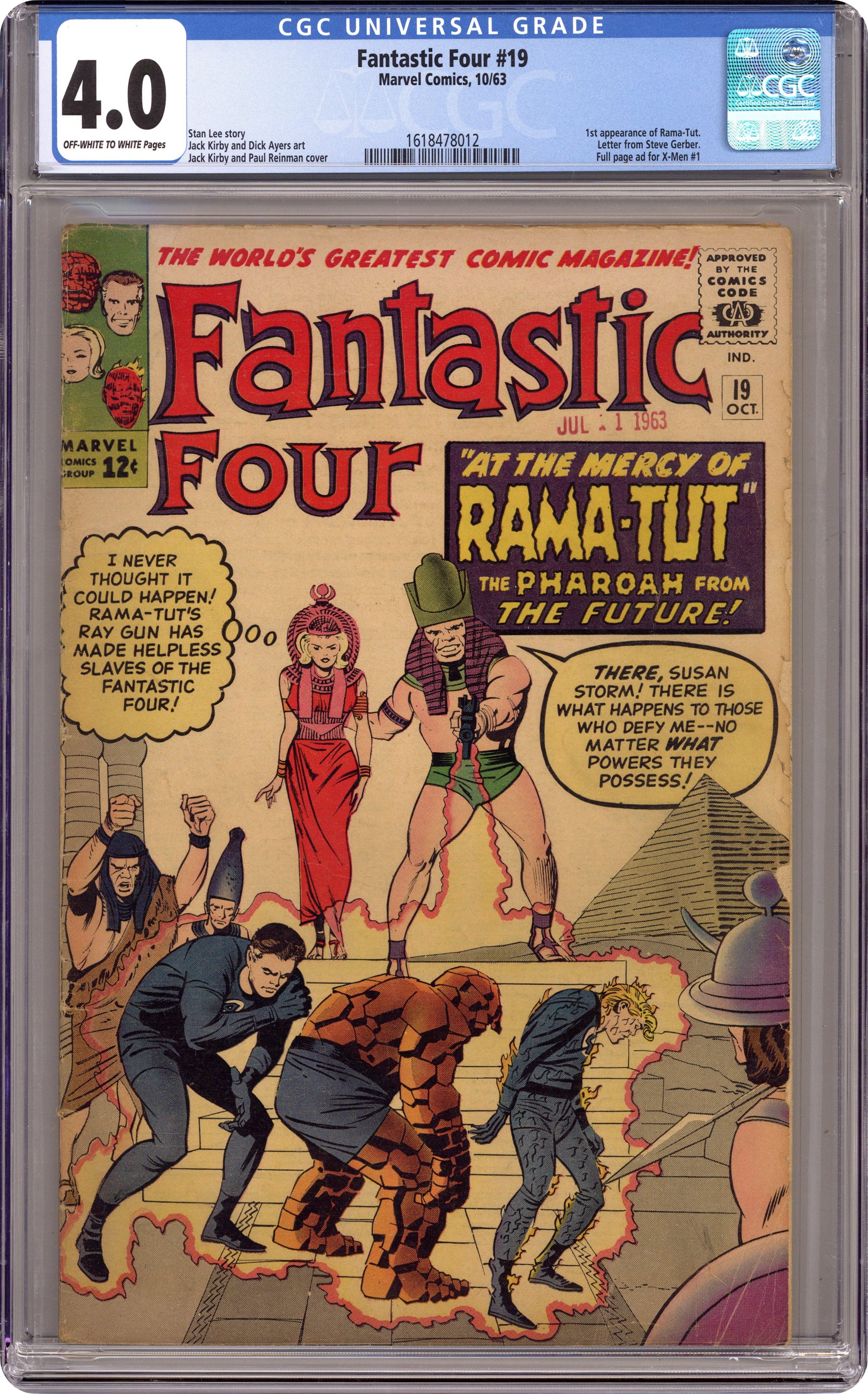 Cover pencils by Jack Kirby, inks by Paul Reinman. First appearance of Pharaoh Rama-Tut in "Prisoners of the Pharoah!, script by Stan Lee, pencils by Jack Kirby, inks by Dick Ayers; The Fantastic Four return to Ancient Egypt to try to find a cure for Alicia's blindness and are met by Rama-Tut, a time traveler from the year 3000. Cameos by the Mole Man, the Puppet Master, the Super-Skrull, and Doctor Doom. Letter to the editor from comics writer Steve Gerber. The events of this very issue can be seen from different points of view in the pages of Doctor Strange (1974 2nd Series) #53 and Avengers West Coast (1985) #22. 36 pgs. $0.12. Cover price $0.12. Grade: CGC 4.0 explanation of grade Condition: Used (collectible)