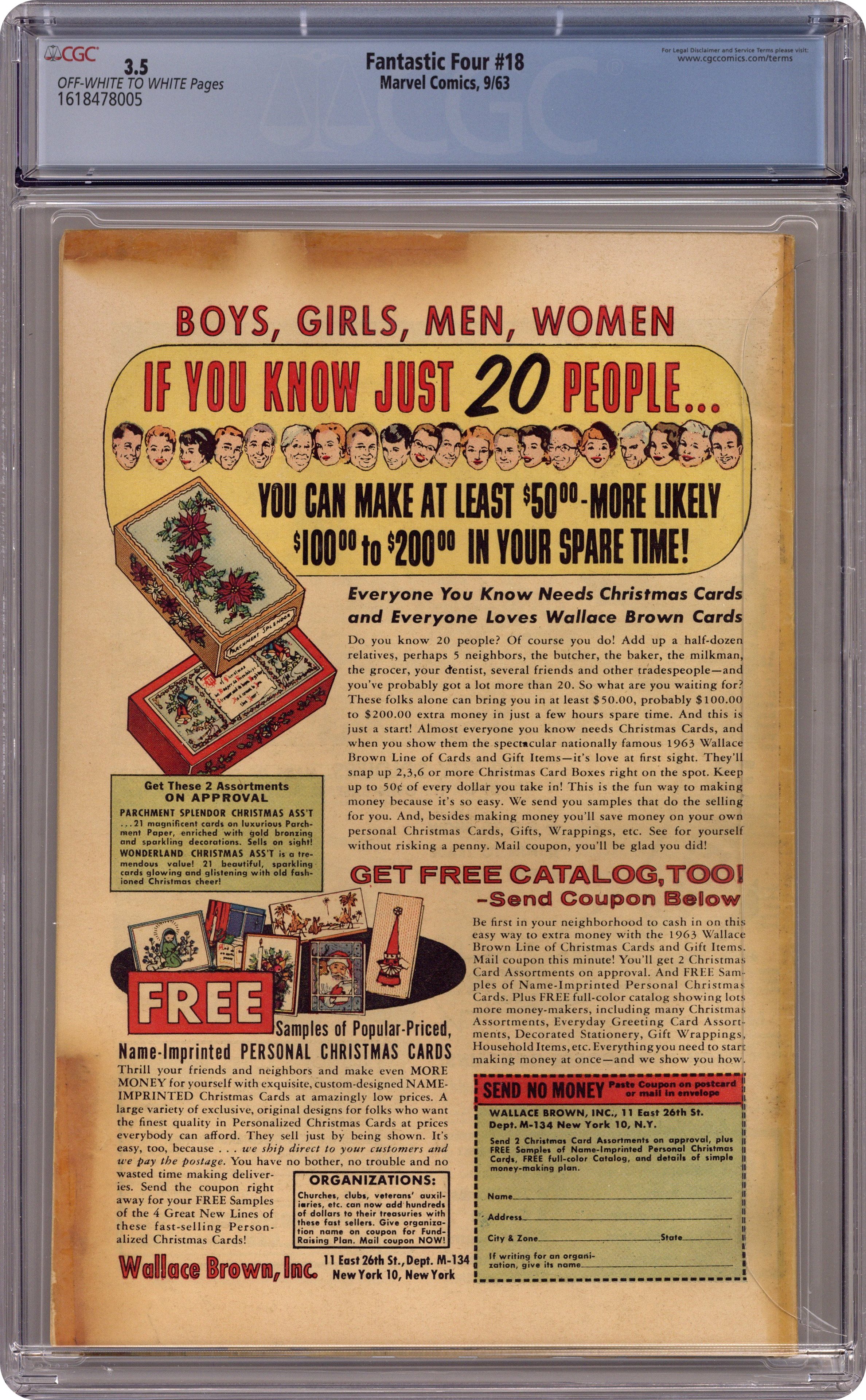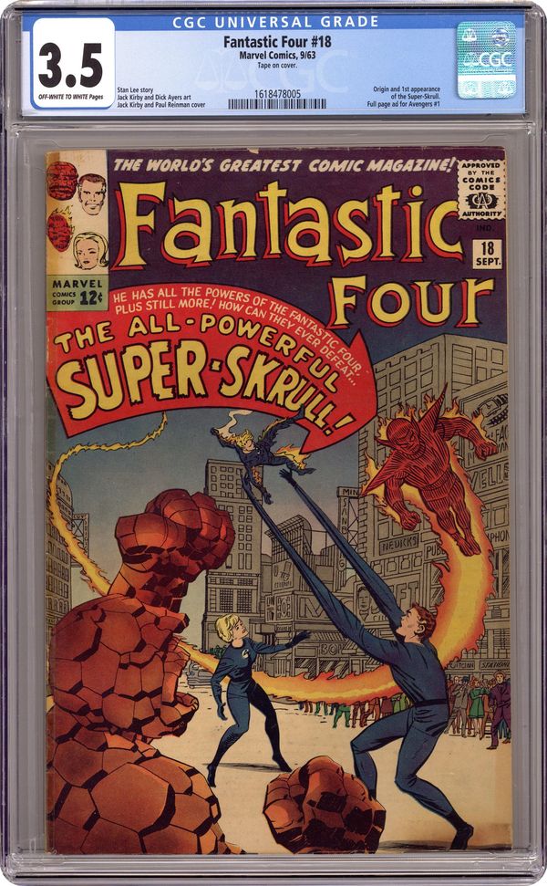 Cover pencils by Jack Kirby, inks by Paul Reinman. Origin and first appearance of the Super Skrull in "A Skrull Walks Among Us!", script by Stan Lee, pencils by Jack Kirby, inks by Dick Ayers; The Skrull Emperor sends the Super-Skrull, a Skrull possessing all the powers of the Fantastic Four, to conquer Earth. In answer to a question from Paul B. Weinstein about who originated the corner cover symbol box, Stan Lee replied: "Steve Ditko dreamed up the idea, and we're sure glad he did!" 36 pgs. $0.12. Cover price $0.12. Grade: CGC 3.5 explanation of grade Condition: Used (collectible)