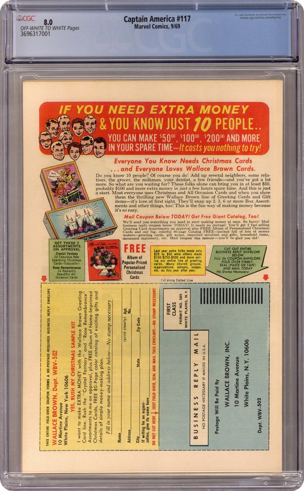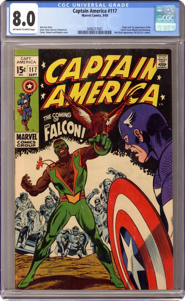 Cover pencils by Gene Colan and John Romita (alterations), inks by Joe Sinnott and John Romita (alterations). First appearance and origin of the Falcon in "The Coming of... the Falcon!", script by Stan Lee, pencils by Gene Colan, inks by Joe Sinnott; With the Red Skull previously having switched bodies with Captain America, the Skull uses the Cosmic Cube to send Cap to the tropical island home of the Exiles; There Cap encounters a falconer from Harlem who had been hired by the Exiles but who is now attempting to help the island natives kick the Exiles from their home; Cap joins forces with the falconer who, with Cap's urging, dons a costume and takes the name the Falcon. Letter to the editor from writer James Van Hise. 36 pgs., full color. $0.15. Cover price $0.15. Grade: CGC 8.0 explanation of grade Condition: Used (collectible)