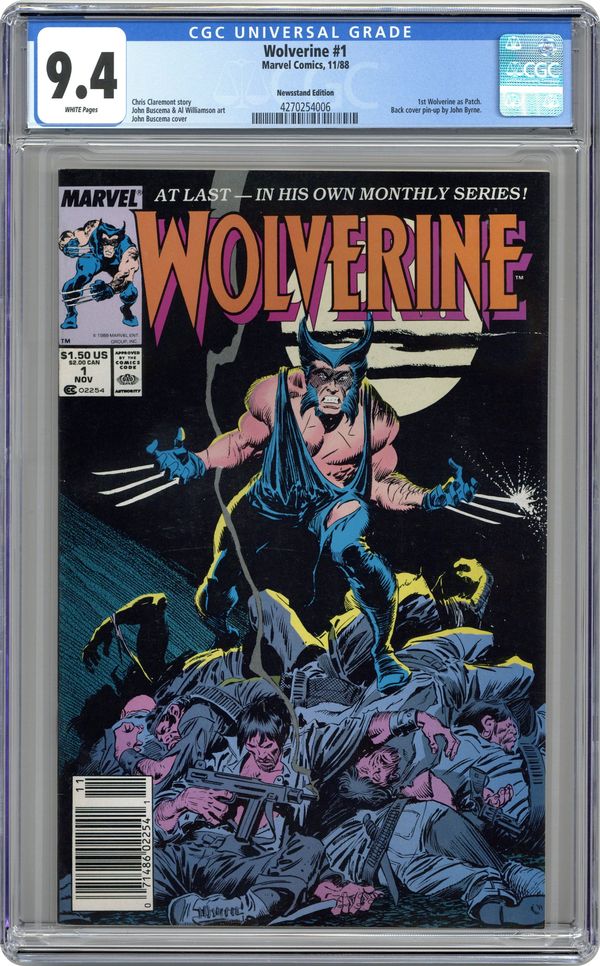 Newsstand Edition. Part 1 of 3 - "Swordquest!" Written by Chris Claremont. Art by John Buscema and Klaus Janson. Wolvie slices through a pile of pirate slavers, and on his way to Mandripoor discovers a plot by the Black Blade to obtain the legendary Muramasa Sword. John Byrne art on back cover. NOTE: 1st appearance of Wolverine as Patch. Cover price $1.50. Grade: CGC 9.4 explanation of grade Condition: Used (collectible)